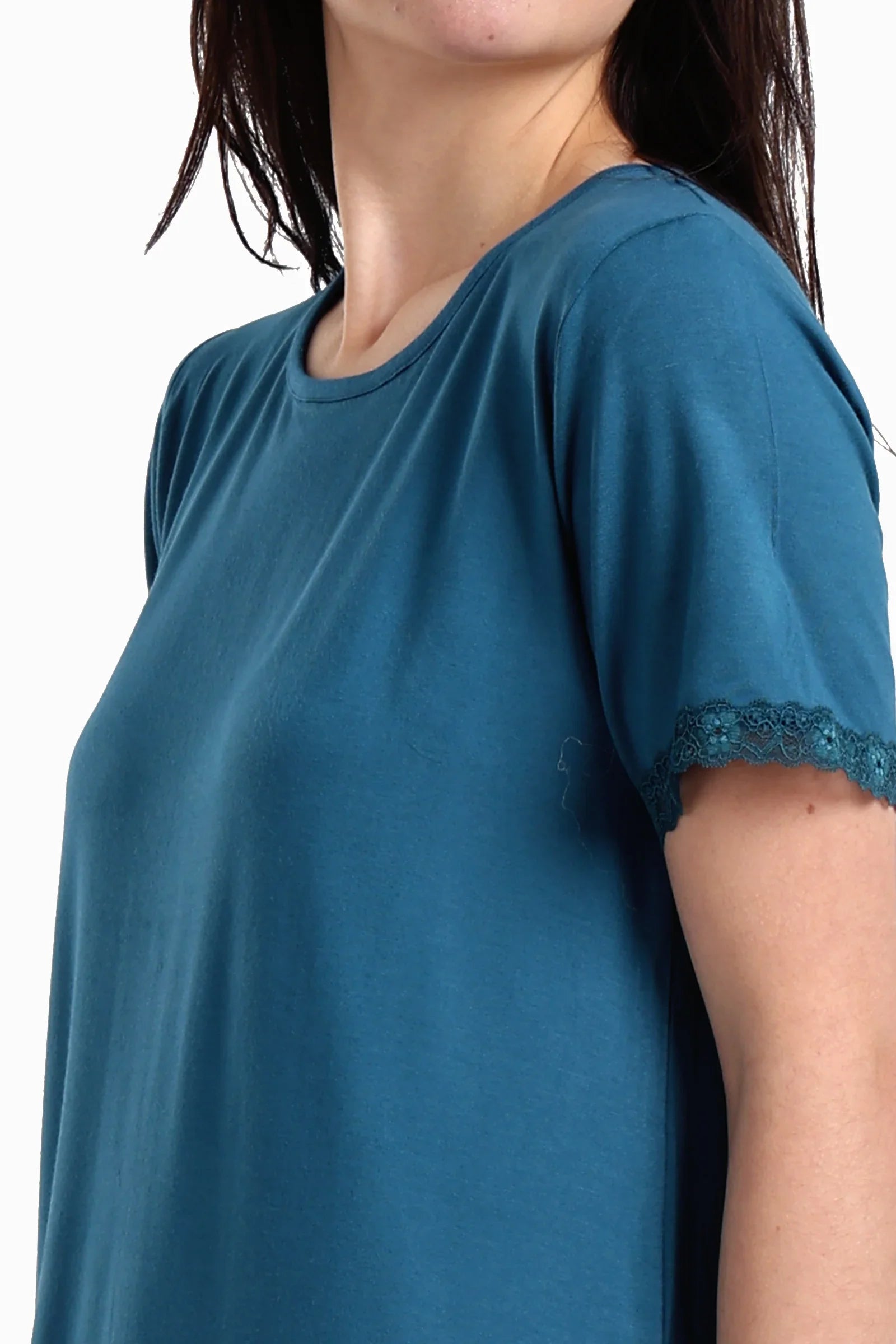 يجمع قميص النوم الساحر هذا بين الراحة والأناقة، مما يجعله خيارًا رائعًا لمجموعة ملابس نومكِ. مصمم بقصّة مريحة، يوفر شعورًا مريحًا ومريحًا، مثاليًا للاسترخاء في نهاية اليوم. يكتمل نقشه الموحد بتفاصيل دانتيل رقيقة على الأكمام والحاشية، مما يضفي لمسة من الأنوثة والرقي. يتميز بياقة دائرية كلاسيكية وأكمام قصيرة، وهو مثالي لليالي الدافئة. طوله القصير يُعزز سهولة الحركة، بينما يضمن تصميمه سهل الارتداء ارتداءً مريحًا. سواءً للاسترخاء أو النوم، يتميز قميص النوم هذا بالعملية والأناقة.