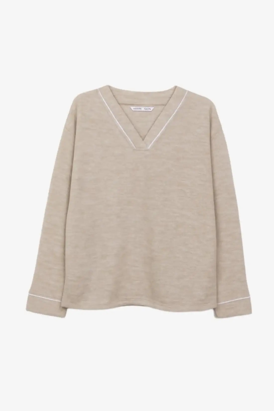 طقم البيجاما هذا مصنوع من قماش محبوك ناعم، بقصة عادية لراحة مثالية. يتميز بنقشة أنيقة، وياقة على شكل حرف V مع تفاصيل بيضاء، وأكمام طويلة، وبنطال بقصة مستقيمة وخصر مطاطي وجيوب جانبية. تصميمه سهل الارتداء يجعله خيارًا مثاليًا للاسترخاء المريح.