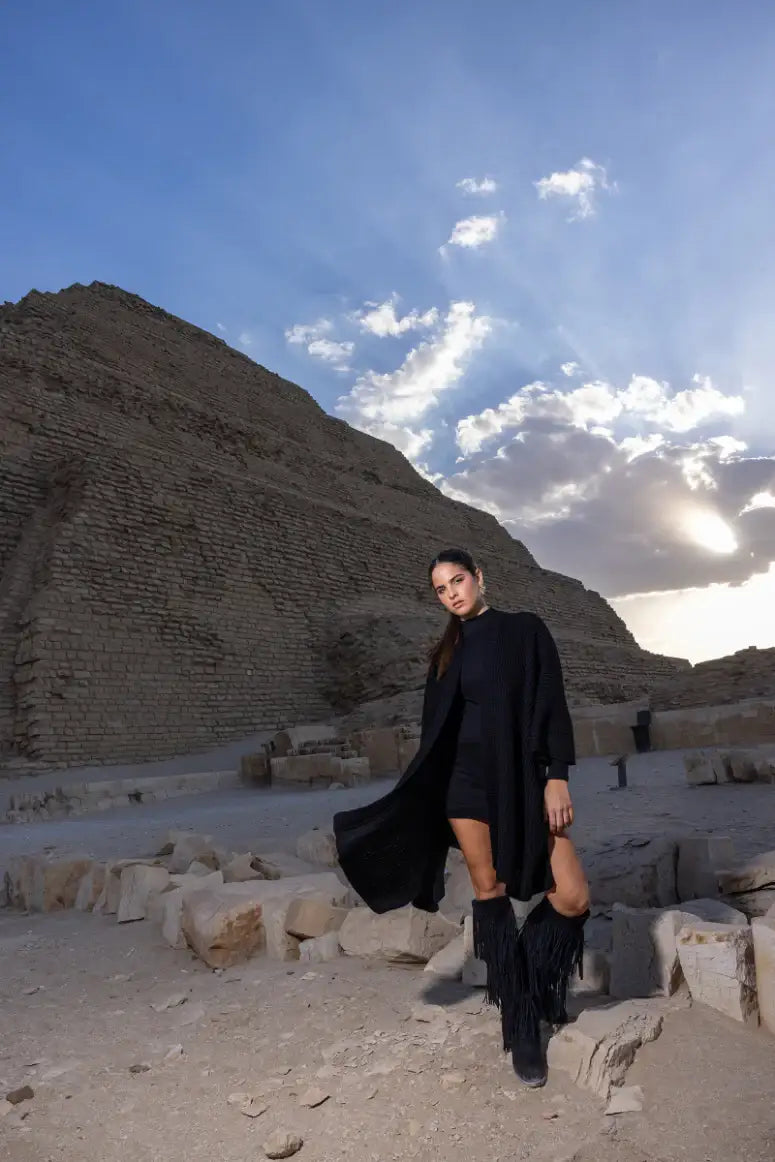 دللي نفسكِ بأناقةٍ لا مثيل لها مع هذا البونشو المحبوك، المصمم ليمنحكِ الراحة والأناقة. مصنوع من قماش محبوك ناعم، يتميز بنقشة سادة وقصة واسعة تُنسدل بسلاسة فوق أي إطلالة. يُضفي خط العنق المفتوح والأكمام الطويلة الواسعة لمسةً من الراحة على مظهره، بينما يُضفي تصميمه غير المتماثل لمسةً عصريةً أنيقة. مثالي للارتداء فوق طبقات، هذه القطعة ذات المقاس الواحد قطعة أساسية متعددة الاستخدامات للأيام الباردة والأمسيات المنعشة.
