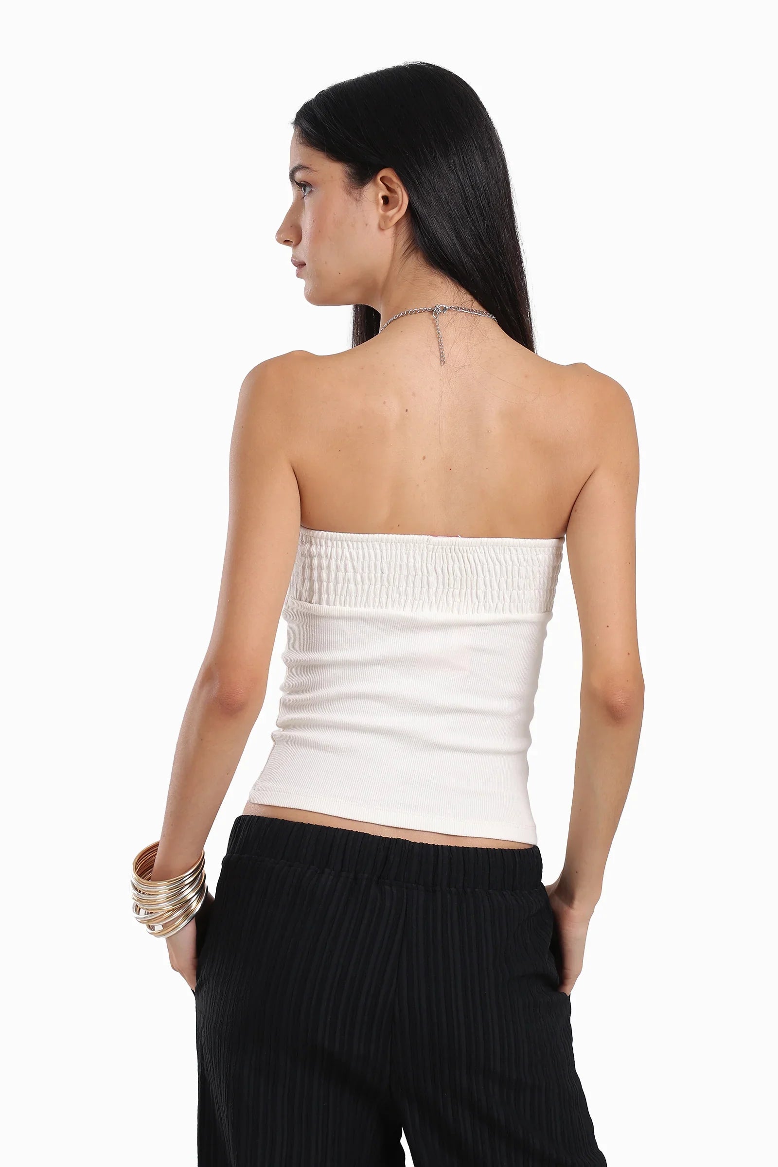 يبدو هذا القميص مصنوعًا من قماش قطني ناعم ومضلع، مما يوفر شعورًا بالراحة والتهوية. يتميز بتصميم بدون حمالات، وقصة ضيقة مع تفاصيل مجمعة أو ملتوية في المنتصف، مما يمنحه شكلًا جذابًا. تصميمه البسيط يجعله قطعة متعددة الاستخدامات، يمكن ارتداؤه في مناسبات متنوعة.