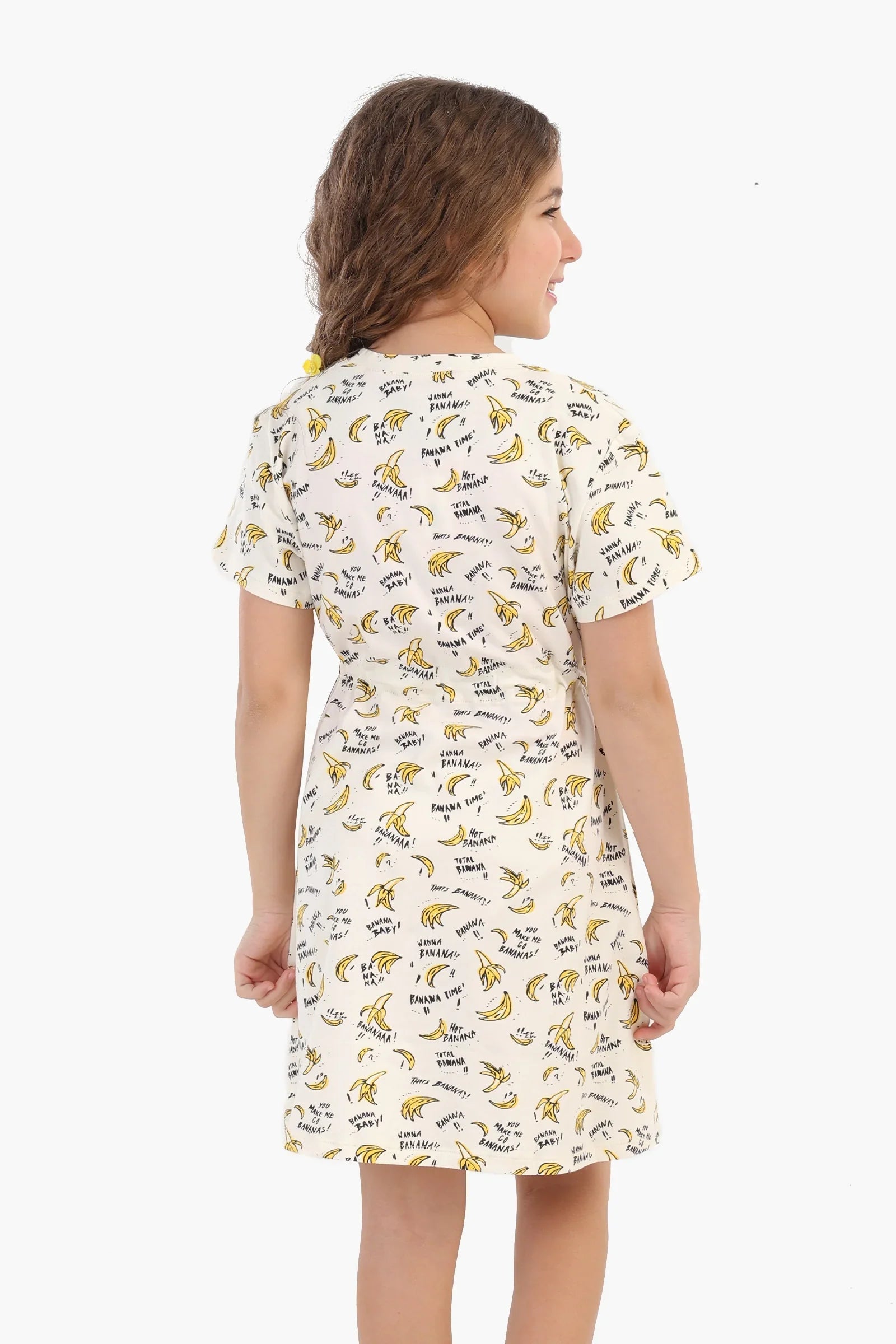 قميص النوم الرائع هذا بطبعة الموز مصنوع من القطن الناعم لراحة فائقة. قصته العادية ونقشته المطبوعة المرحة تجعله مريحًا وممتعًا لوقت النوم. يتميز برقبة دائرية وأكمام قصيرة ورباط خصر، مما يجعله سهل الارتداء ومثاليًا لنوم هانئ.