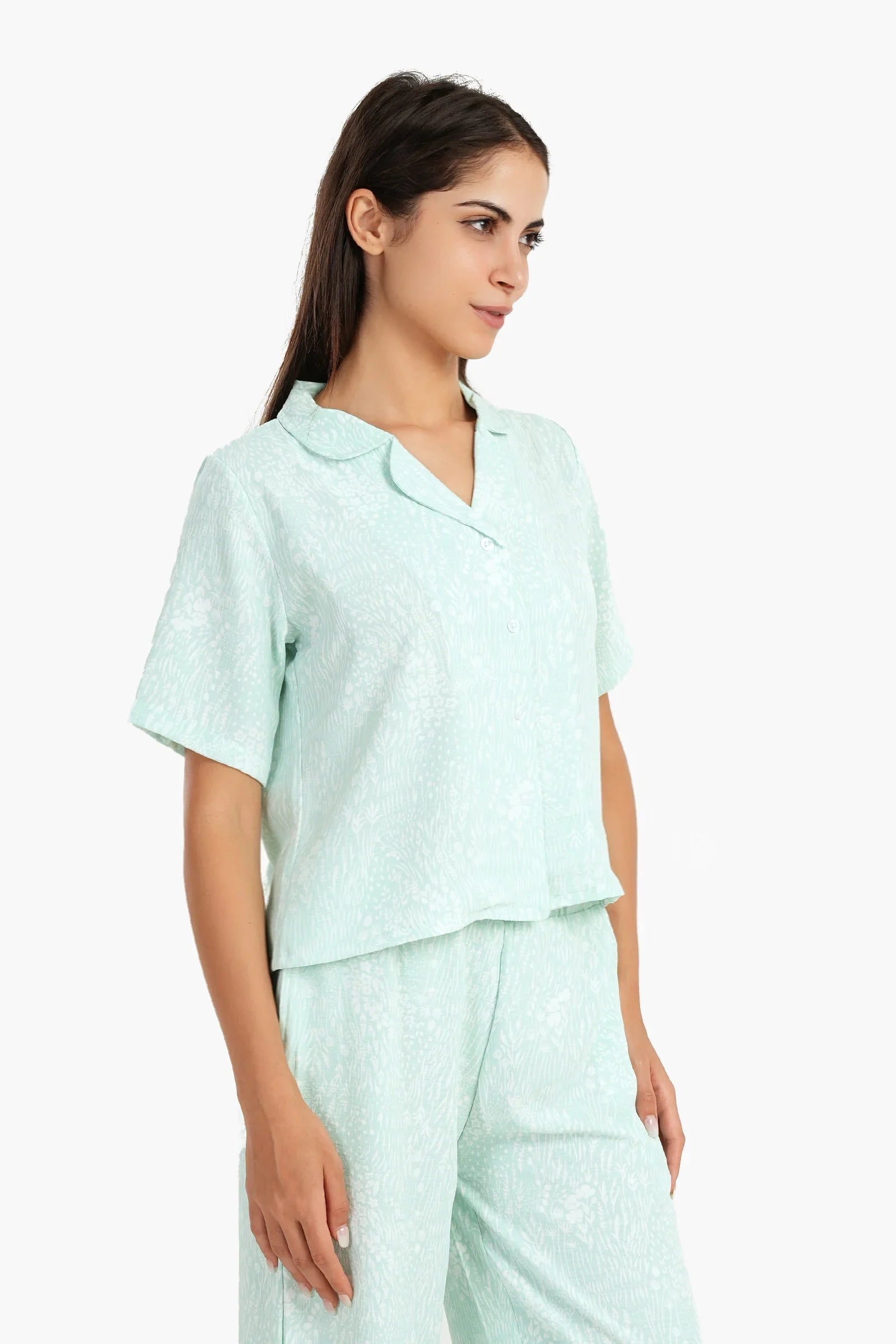 هذه البيجاما الزرقاء، المصنوعة من القطن الناعم، تتميز بقصّة عادية تجمع بين الراحة والأناقة. يضفي التصميم المبتكر لمسةً من الأناقة، بينما تمنحها الياقة المدببة مظهرًا كلاسيكيًا أنيقًا. تتميز هذه البيجاما بأزرار للإغلاق وأكمام قصيرة، مما يجعلها مثالية لليالي الدافئة أو للاسترخاء في المنزل.