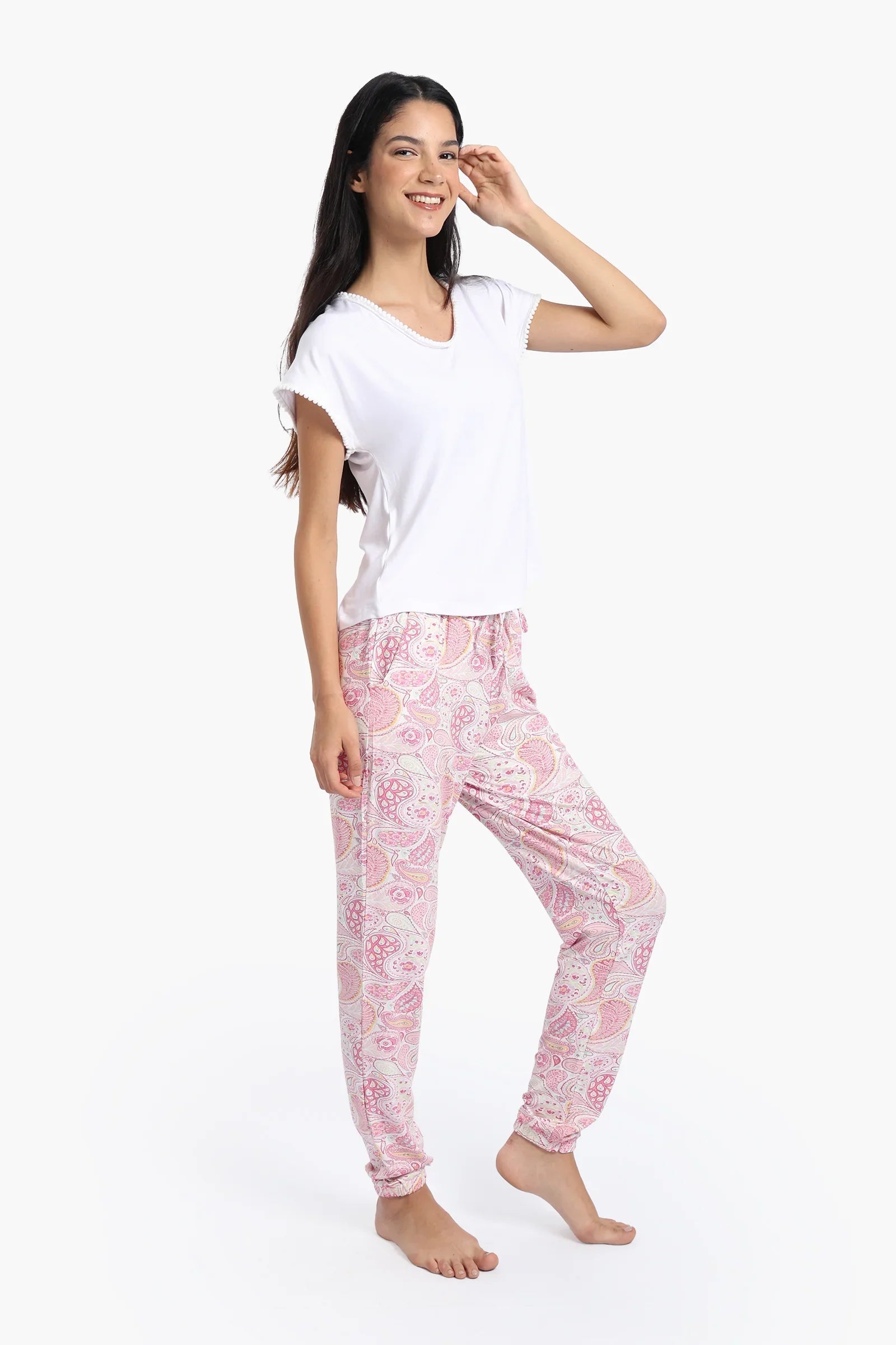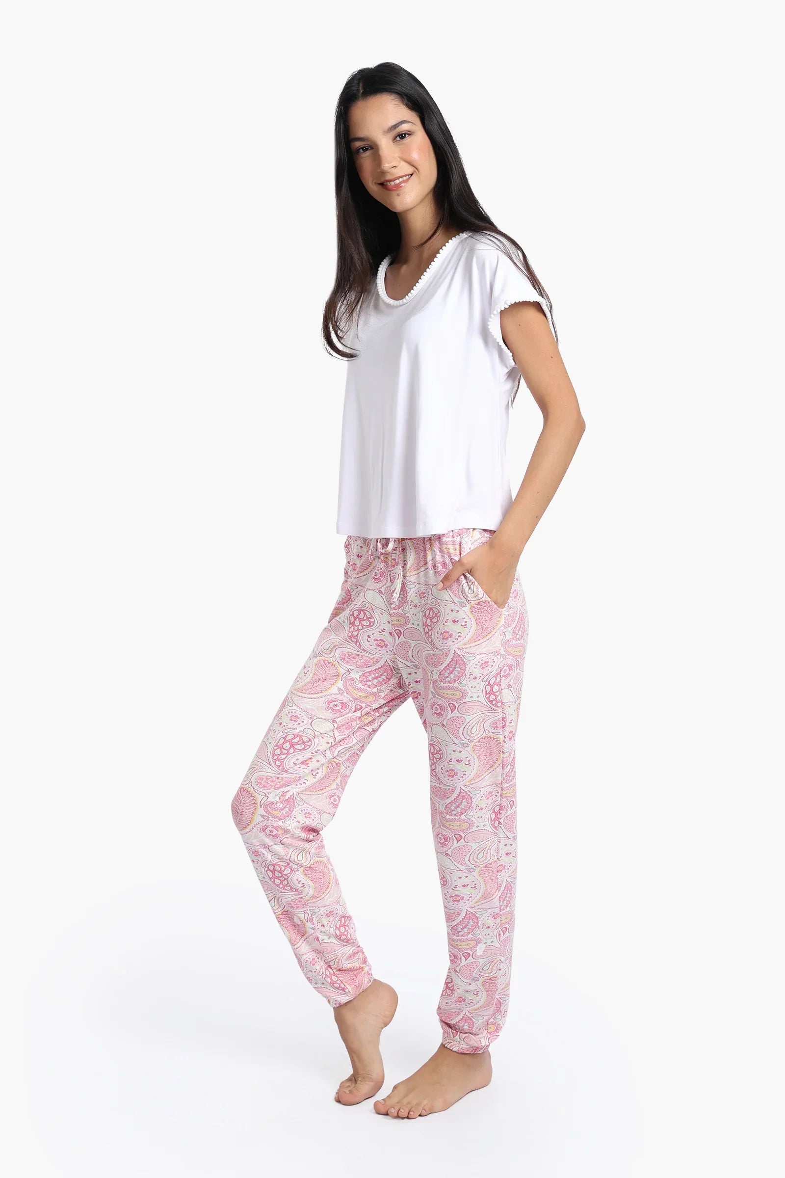تجمع هذه البيجامة القطنية المكونة من قطعتين بين الأناقة والراحة، حيث تجمع بين التفاصيل المرحة وسهولة الاستخدام اليومية. تتميز القطعة العلوية الصلبة بحواف كروية، وياقة دائرية، وأكمام قصيرة، وفتحة خلفية جذابة برباط قابل للتعديل. يمكن تنسيقها مع سروال مطبوع طويل، حيث يوفر حزام الخصر المرن وقصة الساق الجزرة ملاءمة مريحة وجذابة. مزودة بجيوب جانبية، هذه البيجامة مثالية للاسترخاء أو ملابس نوم أنيقة.