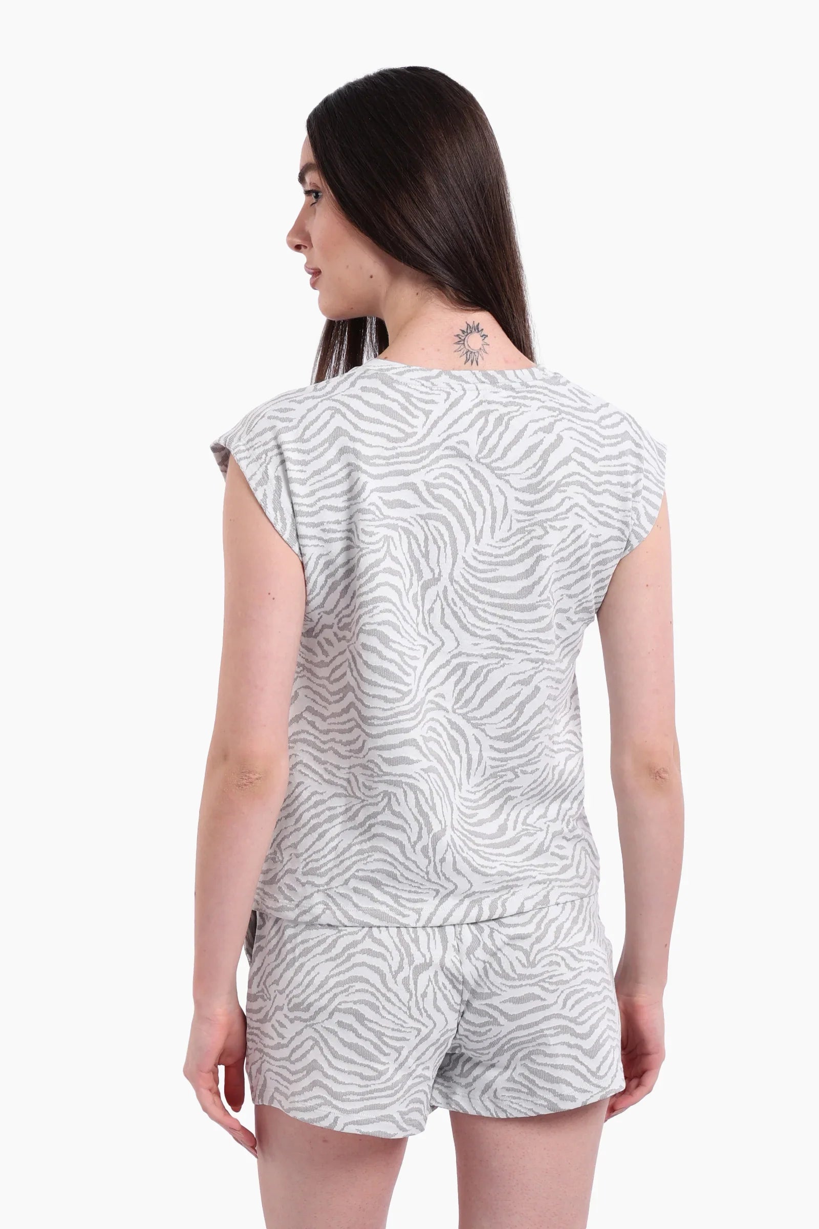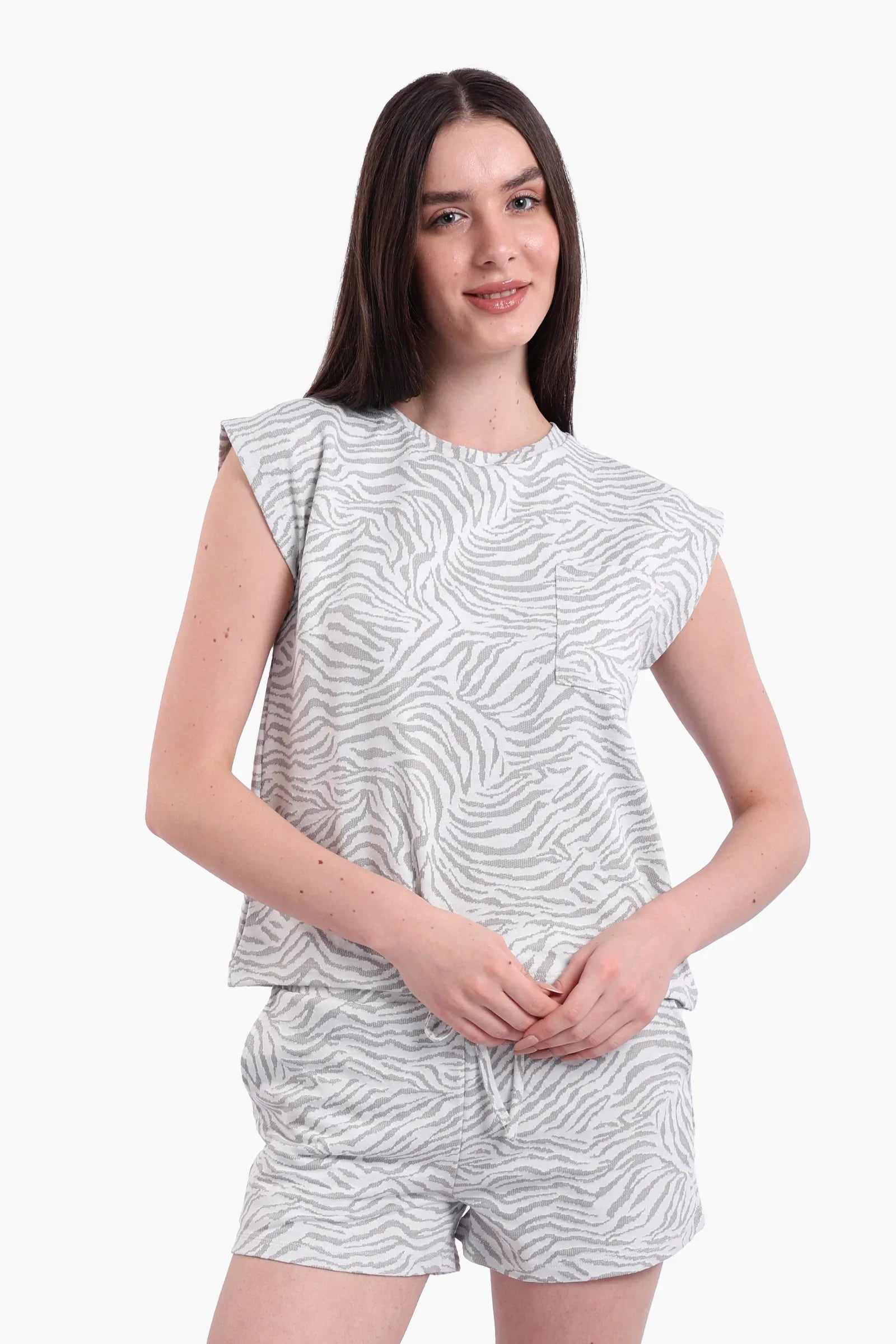 استمتعي براحة لا مثيل لها مع طقم البيجامة القطني المريح هذا، حيث تلتقي نعومة التهوية بأناقتكِ اليومية. يتميز الجزء العلوي بطبعة نابضة بالحياة، وياقة دائرية، وأكمام قصيرة واسعة تسمح لكِ بالتحرك بحرية. يُضفي جيب الصدر العملي لمسةً من العملية والجاذبية. يُكمل الشورت المتناسق الإطلالة بحزام خصر مطاطي ورباط قابل للتعديل، مما يمنحكِ مقاسًا مُخصصًا ومريحًا طوال الليل. سواء كنتِ تسترخي بعد يوم حافل أو تسترخي في صباح كسول، فإن هذا الطقم سهل الارتداء يُبقيكِ منتعشة ومرتاحة وجميلة بلا شك.