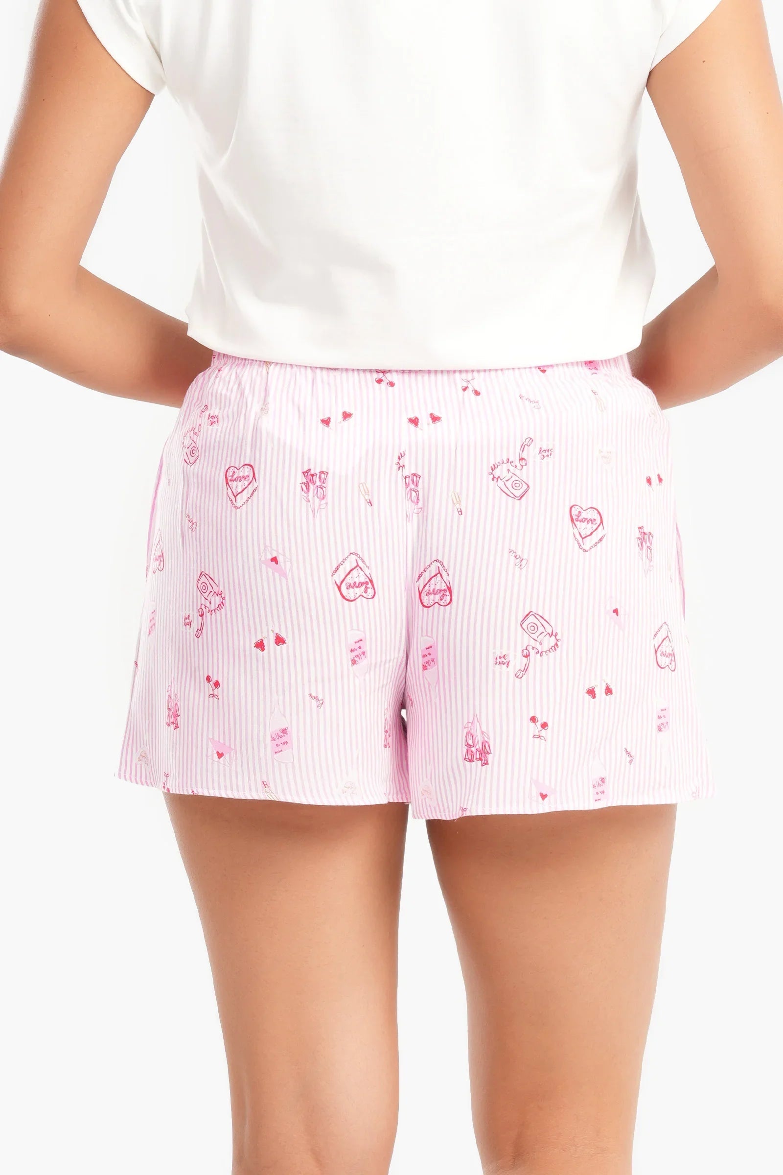 شورت البيجاما هذا، المصنوع من فيسكوز ناعم وجيد التهوية، يتميز بقصّة عادية مع نقشة مخططة ومطبوعة أنيقة. خصر مطاطي عالي مع رباط قابل للتعديل يضمن ملاءمة مريحة وآمنة، بينما تضفي الحافة المستديرة لمسة من الأناقة. تصميمه سهل الارتداء يجعله مثاليًا لنوم هانئ أو للاسترخاء في المنزل.