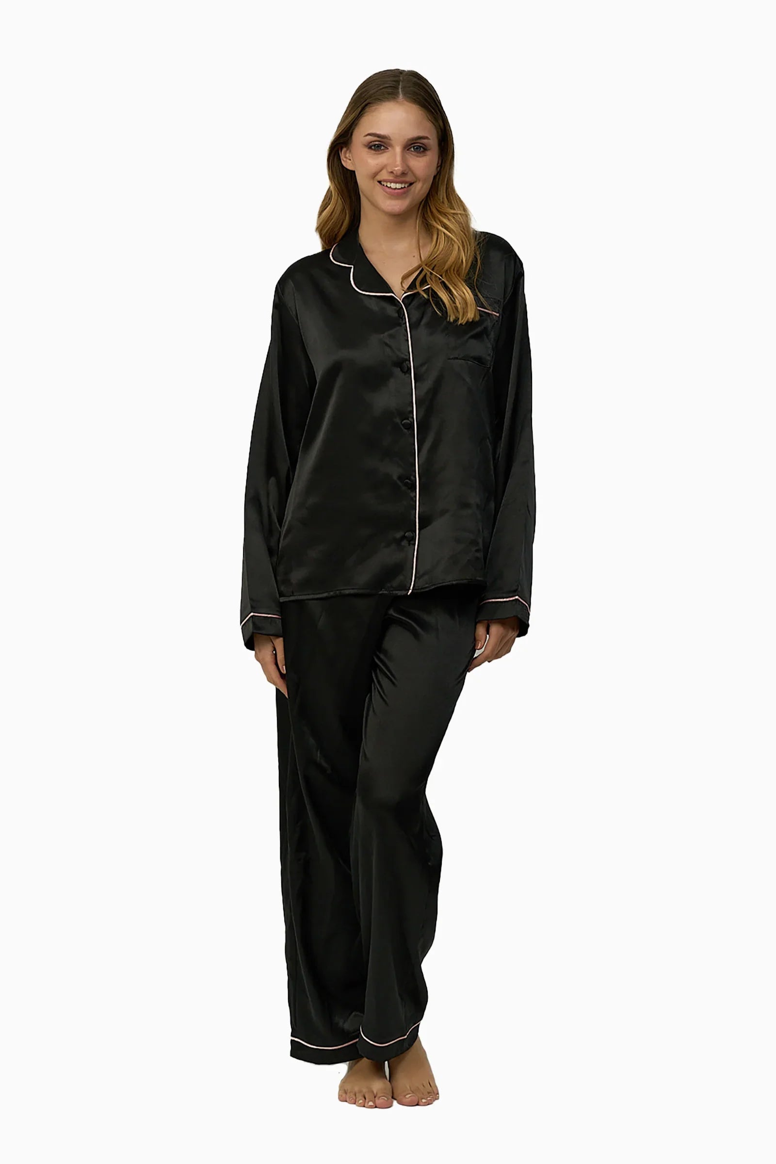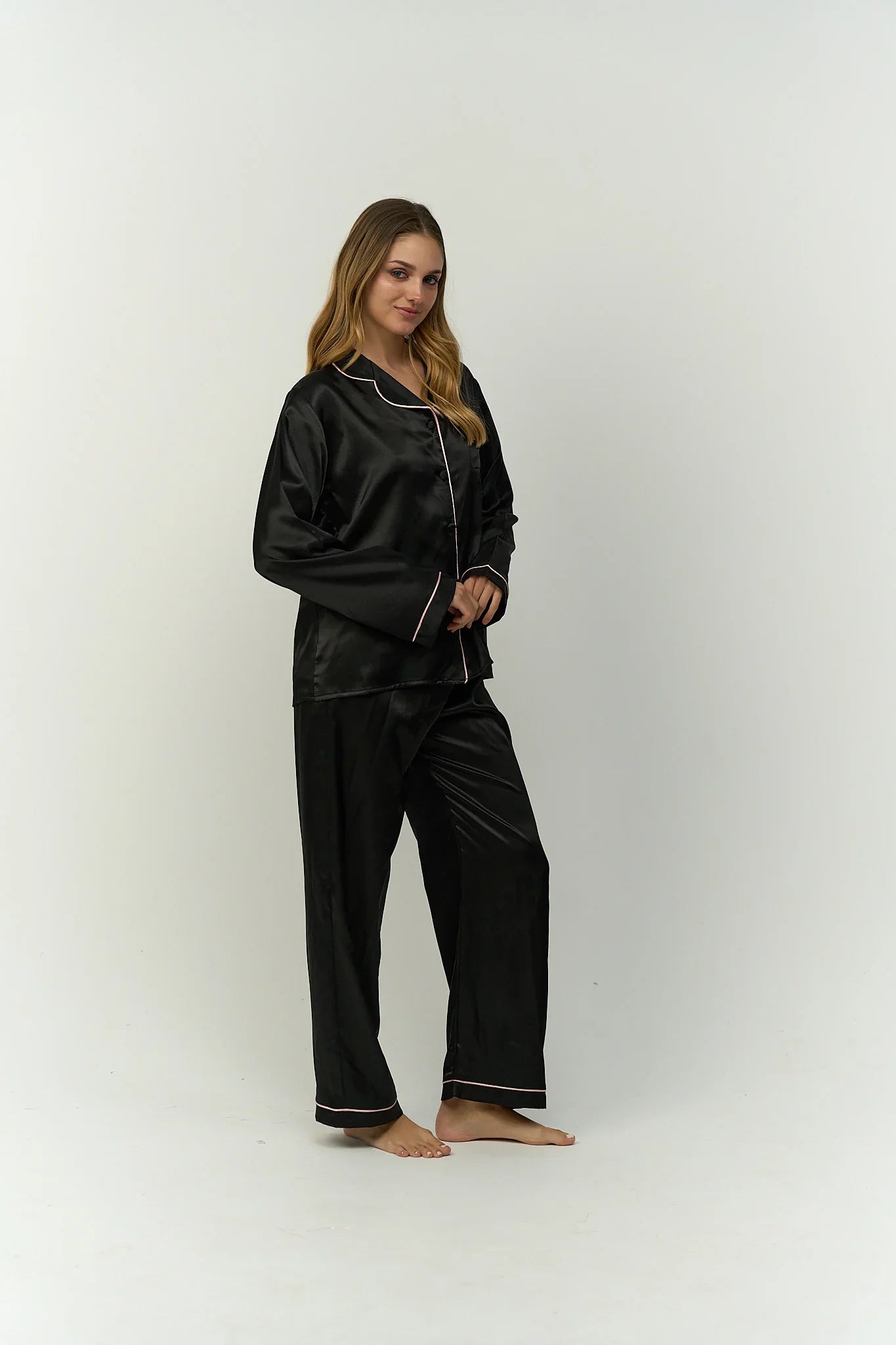 طقم بيجاما ساتان أسود بتطريز وردي، مزيج مثالي من الرقي والراحة. مصنوع من الساتان الناعم، يتميز بقصّة عادية وتصميم أسود سادة أنيق، معزز بتطريز وردي متباين لإطلالة أنيقة. ياقة مدببة وأزرار للإغلاق تضفي عليه لمسة كلاسيكية، بينما توفر الأكمام الطويلة راحة إضافية. السروال ذو الخصر المرن العالي والقصة المستقيمة يمنحكِ قصة أنيقة ومريحة، مما يسهل عليكِ الاسترخاء بأناقة.