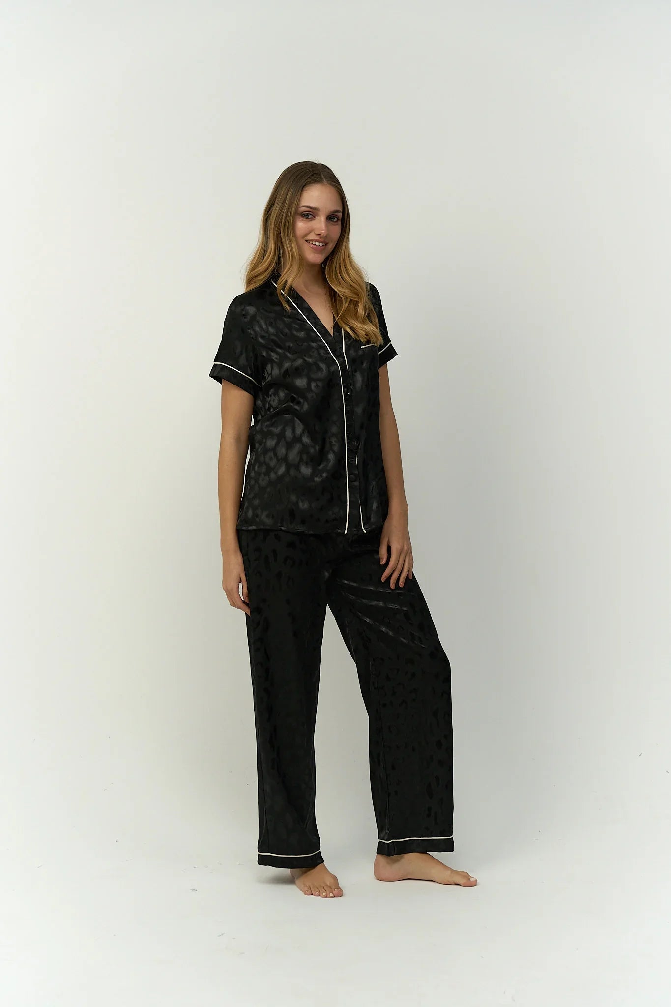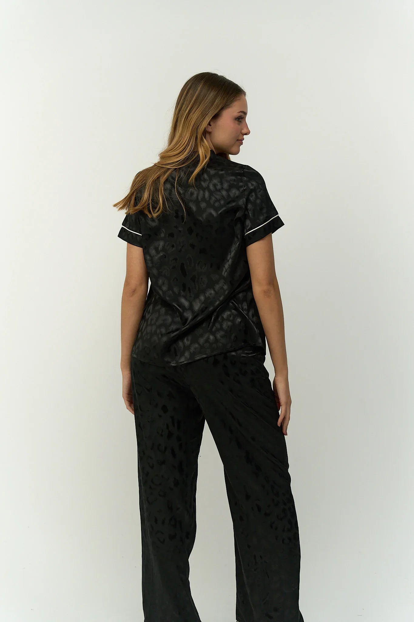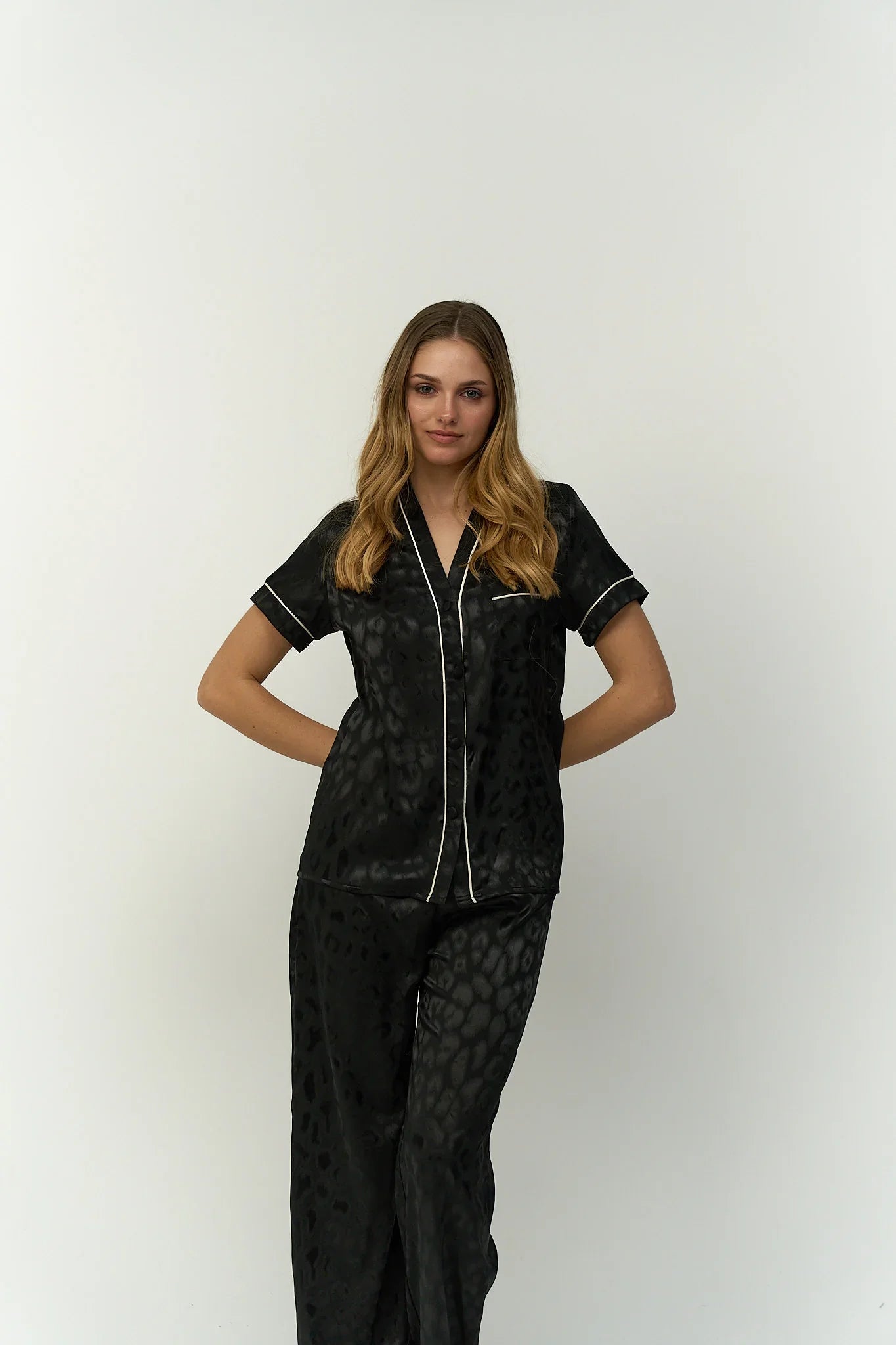 طقم بيجاما أسود من الجاكار بياقة على شكل حرف V، مصنوع من قماش الساتان، يجمع بين الأناقة والراحة لتجربة نوم فاخرة. يتميز هذا الطقم بقصته العادية ونقشة الجاكار، وهو مصمم ليجمع بين الأناقة والسهولة. يأتي الجزء العلوي بياقة على شكل حرف V، وأكمام قصيرة، وإغلاق بأزرار مع فتحة كاملة، مما يمنحك مظهرًا مريحًا وأنيقًا. يضفي جيب الصدر لمسة عملية. يوفر السروال عالي الخصر بحزام خصر مطاطي وقصة مستقيمة ملاءمة مريحة، مما يجعله مثاليًا للاسترخاء أو للارتداء الكاجوال.