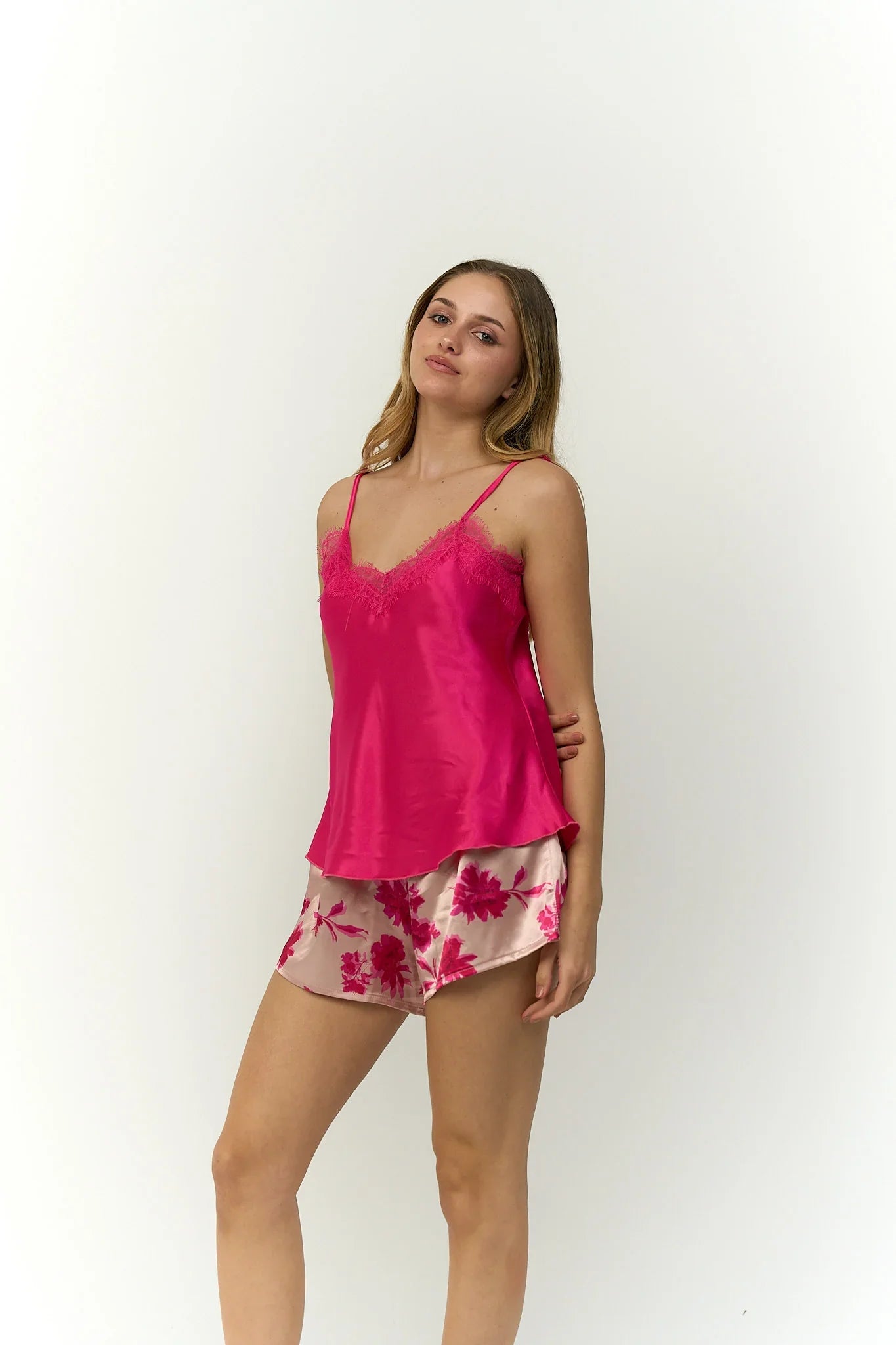 استمتعي بالراحة والأناقة مع طقم بيجاما "القطعة العلوية" الساتان المتين وشورت بطبعة زهور. مصنوع من الساتان الناعم، يوفر هذا الطقم ملمسًا ناعمًا على بشرتكِ، مثاليًا للاسترخاء أو النوم. يُضفي القميص ذو الرقبة على شكل حرف V، والمُزين بالدانتيل الرقيق، لمسة أنثوية، بينما تُبقيكِ الأشرطة الرفيعة والتصميم بدون أكمام منتعشة. يضمن الشورت ذو الطبعة الزهرية والخصر المطاطي العالي ملاءمة مريحة، كما أن تصميمه سهل الارتداء يجعله سهل الارتداء.