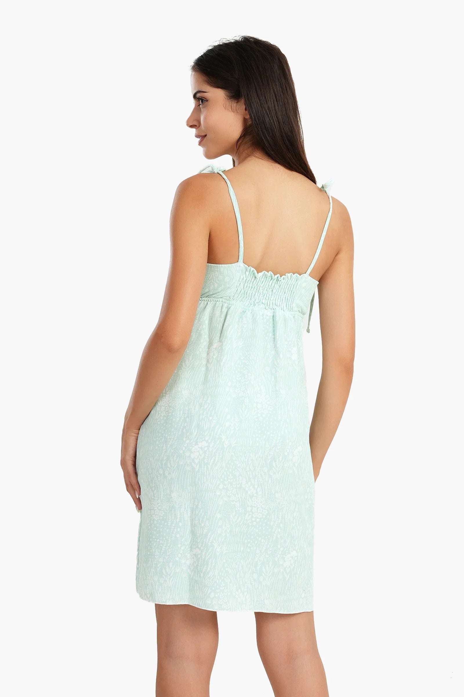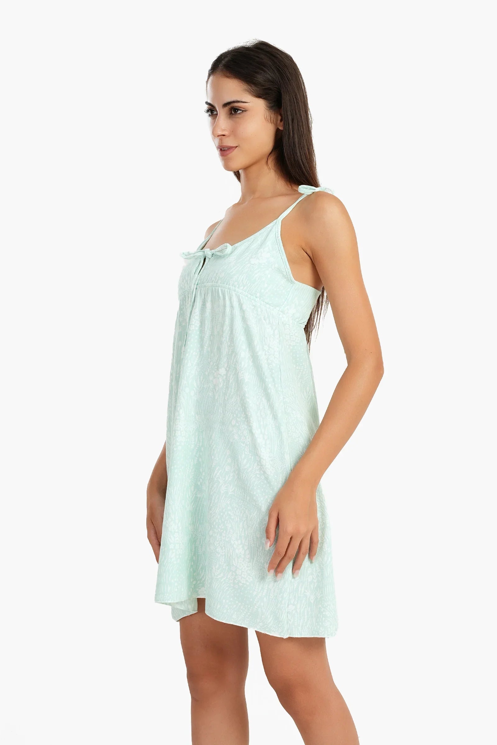 قميص نوم أزرق مائي، مصنوع من الفيسكوز الناعم، يتميز بقصّة عادية مريحة مع نقشة رقيقة على الرقبة لمزيد من الملمس. يتميز بياقة دائرية وتصميم بدون أكمام، وهو مثالي لليالي الدافئة. تتيح لك  الحمالات الرفيعة والأشرطة الإضافية ذاتية الربط على الرقبة ولمسة من الأناقة. بطوله الذي يصل إلى فوق الركبة، يتميز هذا القميص بالراحة والأناقة، مما يجعله خيارًا سهل الارتداء لنوم هانئ أو للاسترخاء.