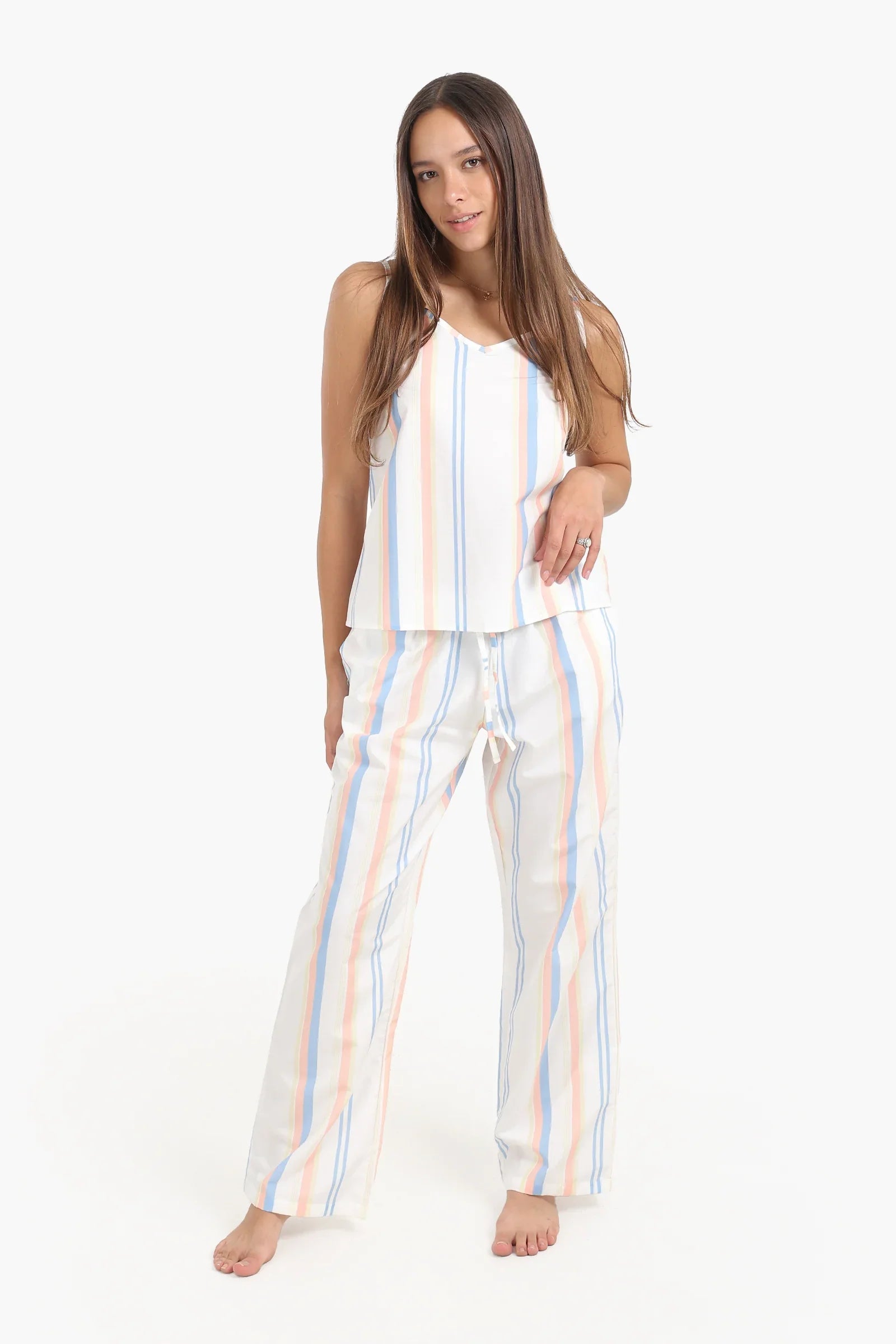 يجمع طقم البيجاما القطني هذا بين الخطوط الكلاسيكية والراحة المطلقة في تصميم أنيق وجيد التهوية. مصنوع من قطن ناعم وخفيف الوزن، يتميز هذا الطقم بقصّة عادية، بجزء علوي بدون أكمام وياقة على شكل حرف V جذابة وحمالات رفيعة قابلة للتعديل لملاءمة مخصصة. تصميم سهل الارتداء يُضفي عليه سحرًا لا مثيل له. يأتي السروال الطويل المطابق بخصر مطاطي ورباط للراحة والمرونة، بالإضافة إلى جيوب جانبية لمزيد من الراحة. يضمن التصميم المستقيم قصّة مريحة مثالية للاسترخاء والنوم.