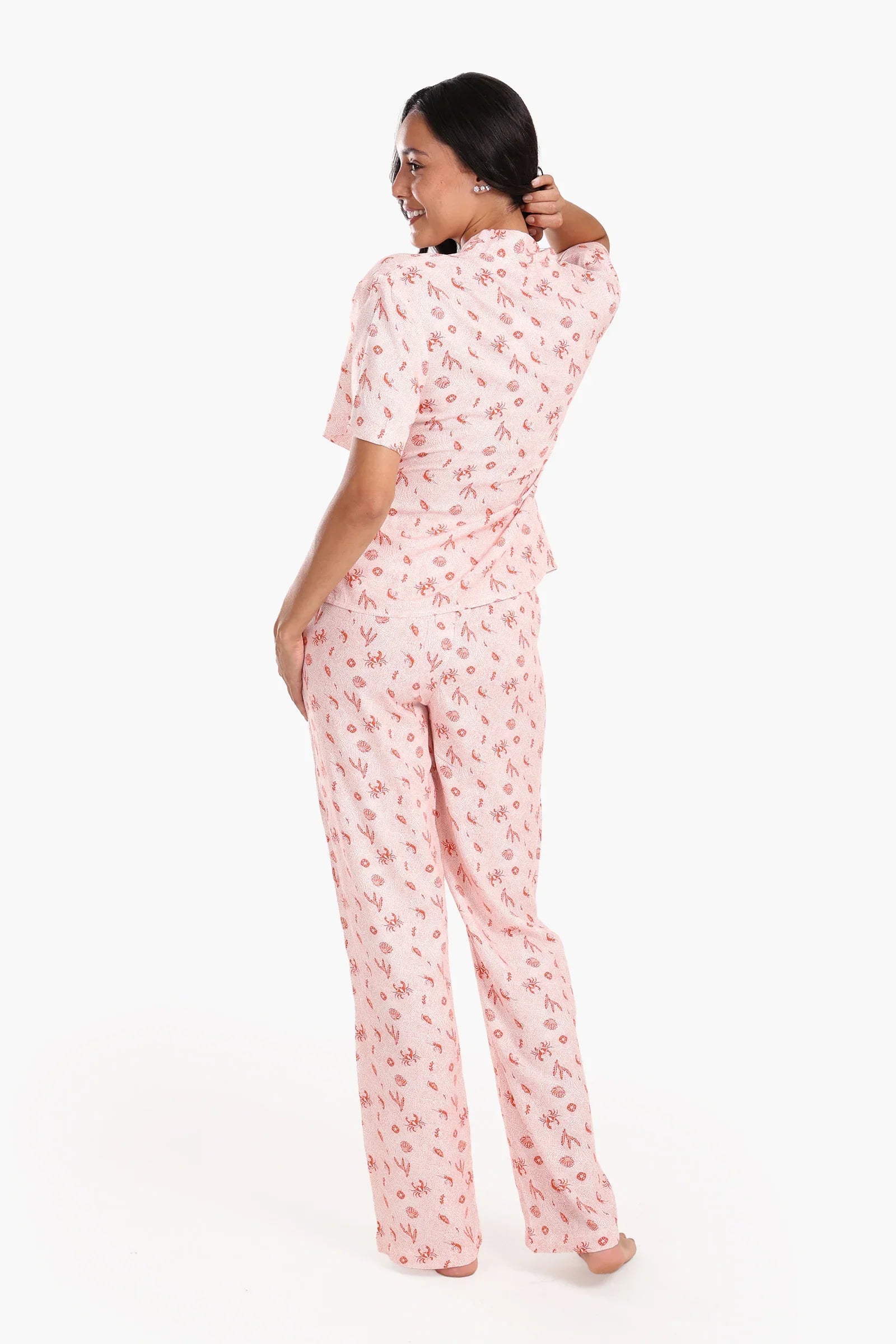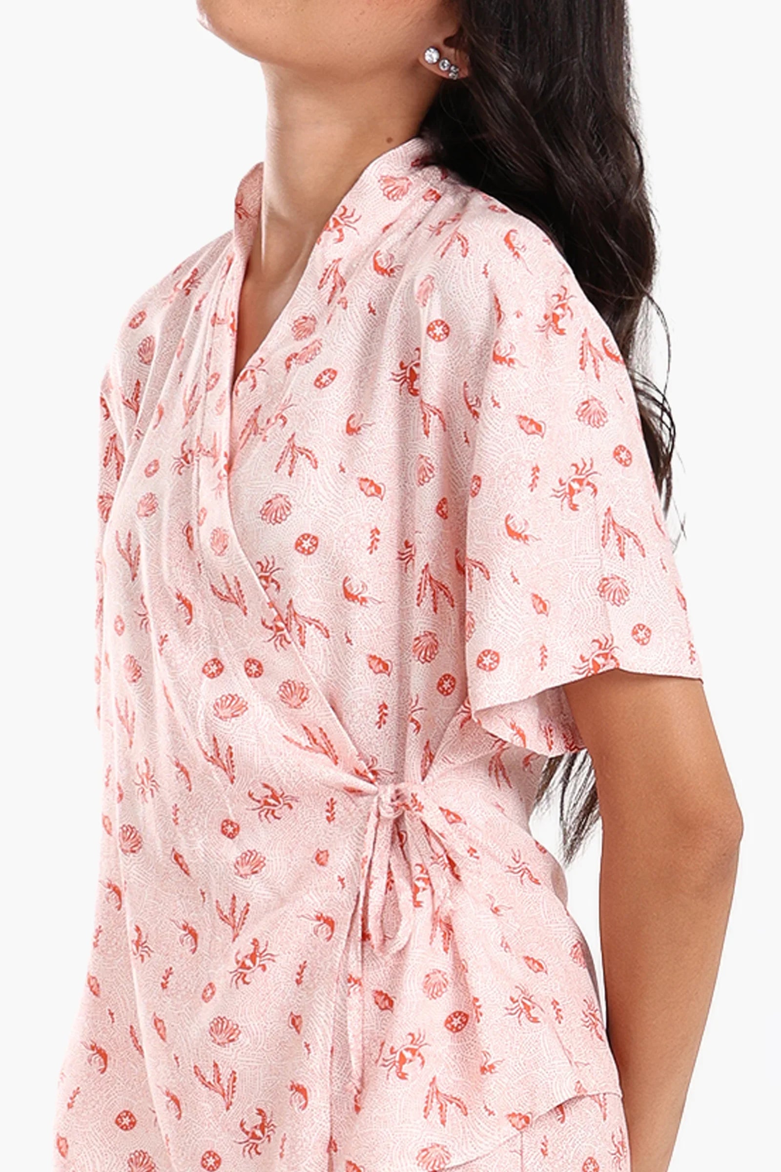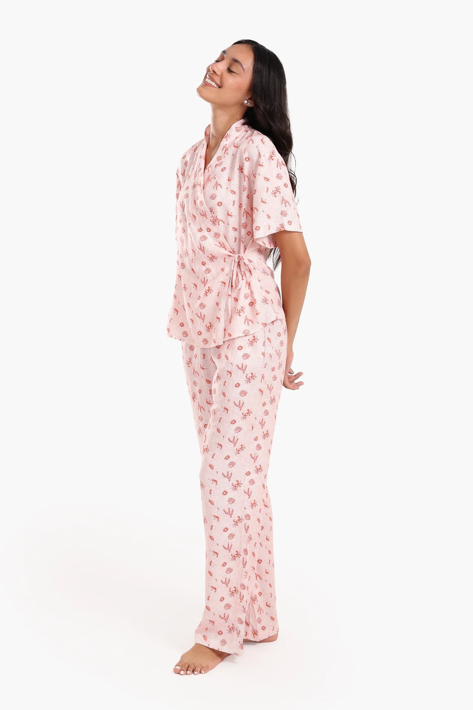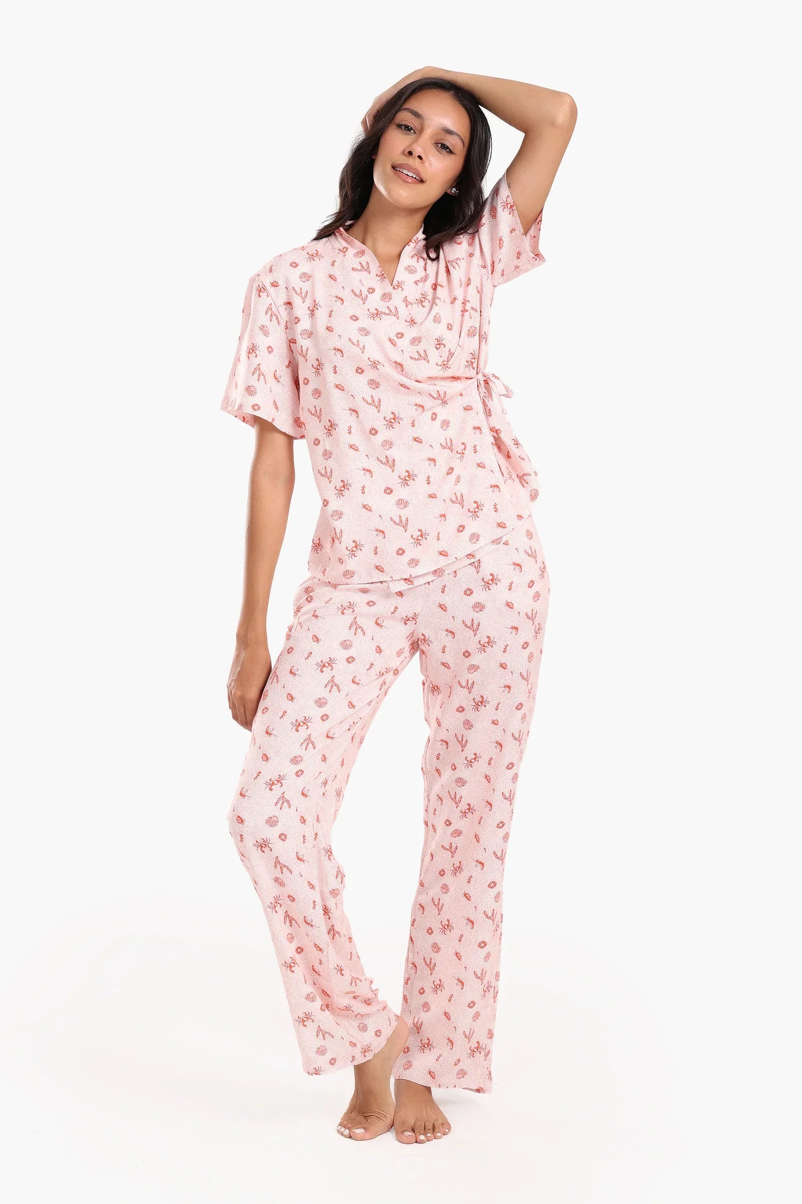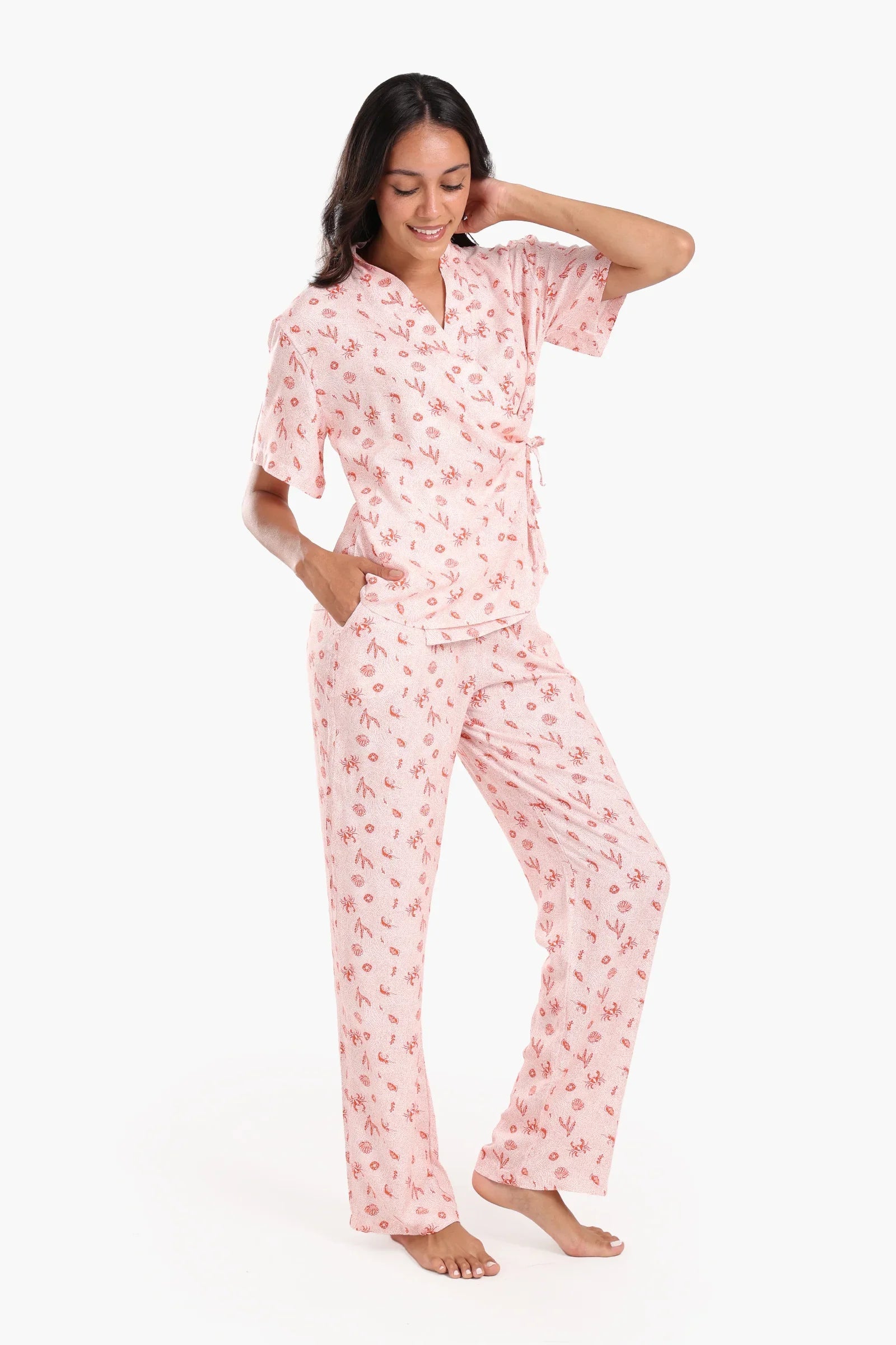 استرخِ بأناقة وراحة تامة مع طقم بيجاما "كراب آند شيل" الساحر. مصنوع من فيسكوز ناعم يسمح بمرور الهواء، يتميز هذا الطقم بقصّة عادية أنيقة ومريحة طوال الليل. طبعة السلطعون والأصداف المرحة تضفي لمسة من المرح، مما يجعل وقت النوم أكثر متعة. يتميز الجزء العلوي بياقة على شكل حرف V أنيقة وتصميم سهل الارتداء مع أكمام قصيرة لشعور مريح وخفيف. يمكن تنسيقه مع سروال طويل بقصّة مستقيمة مع حزام خصر مطاطي وجيوب جانبية عملية، ليجمع بين الأناقة والعملية. مثالي للاسترخاء أو النوم، فهو خيارك الأمثل للراحة والسهولة.