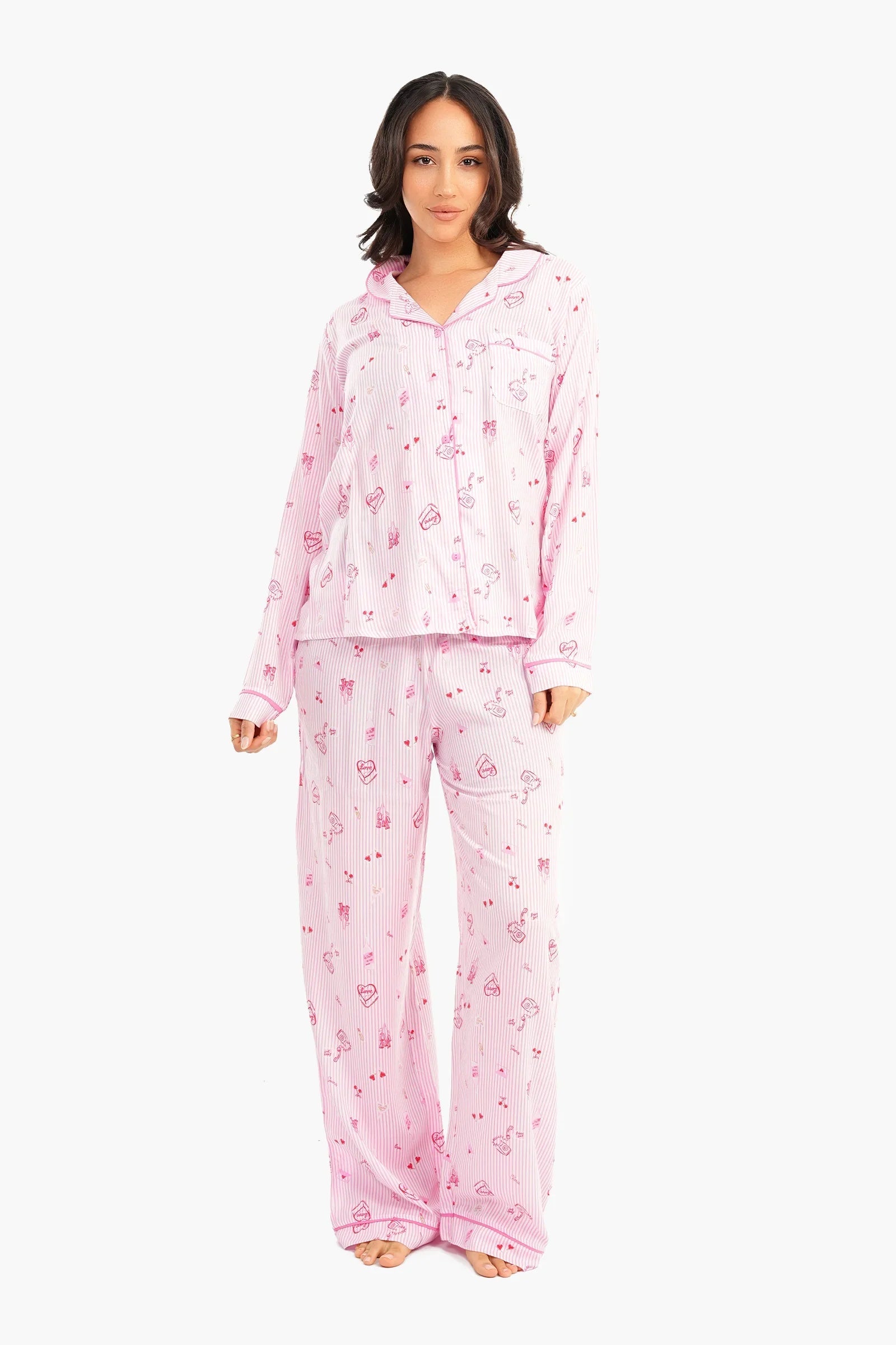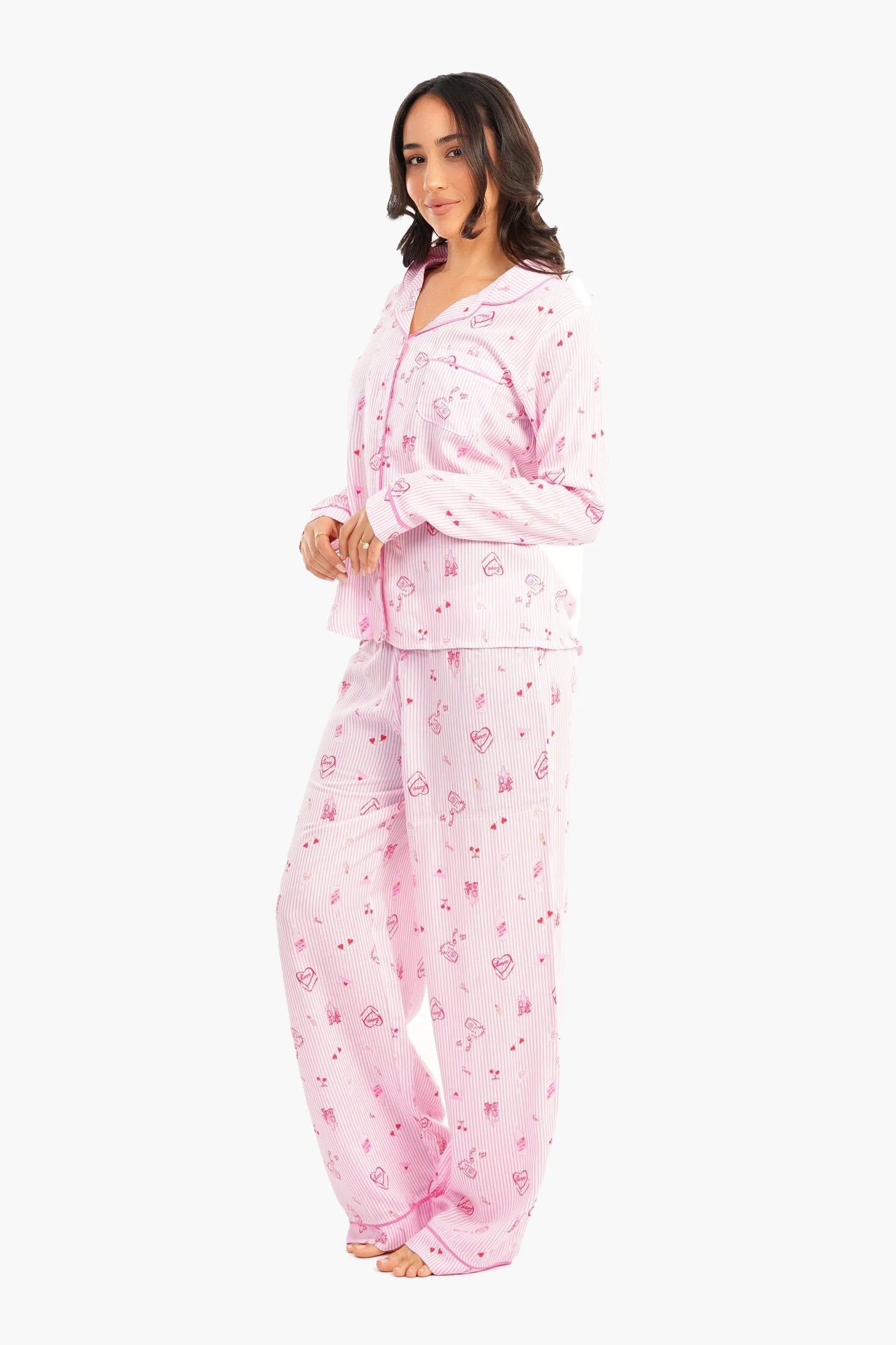 This pink pajama set, crafted from soft viscose, combines style and comfort for a restful sleep. The regular fit is designed for ease of movement without compromising style. Featuring a chic striped and printed pattern, this set adds a fun and sophisticated touch to your sleepwear collection. The top features a classic pointed collar and button fastening, making it easy to put on and take off. The long sleeves provide extra coverage for chilly nights, and the chest pocket adds a practical touch. The pants are designed with an elasticated waist for a comfortable, secure fit and a straight cut to flatter all body types. Featuring a full length for added warmth, this set is perfect for lounging in style.