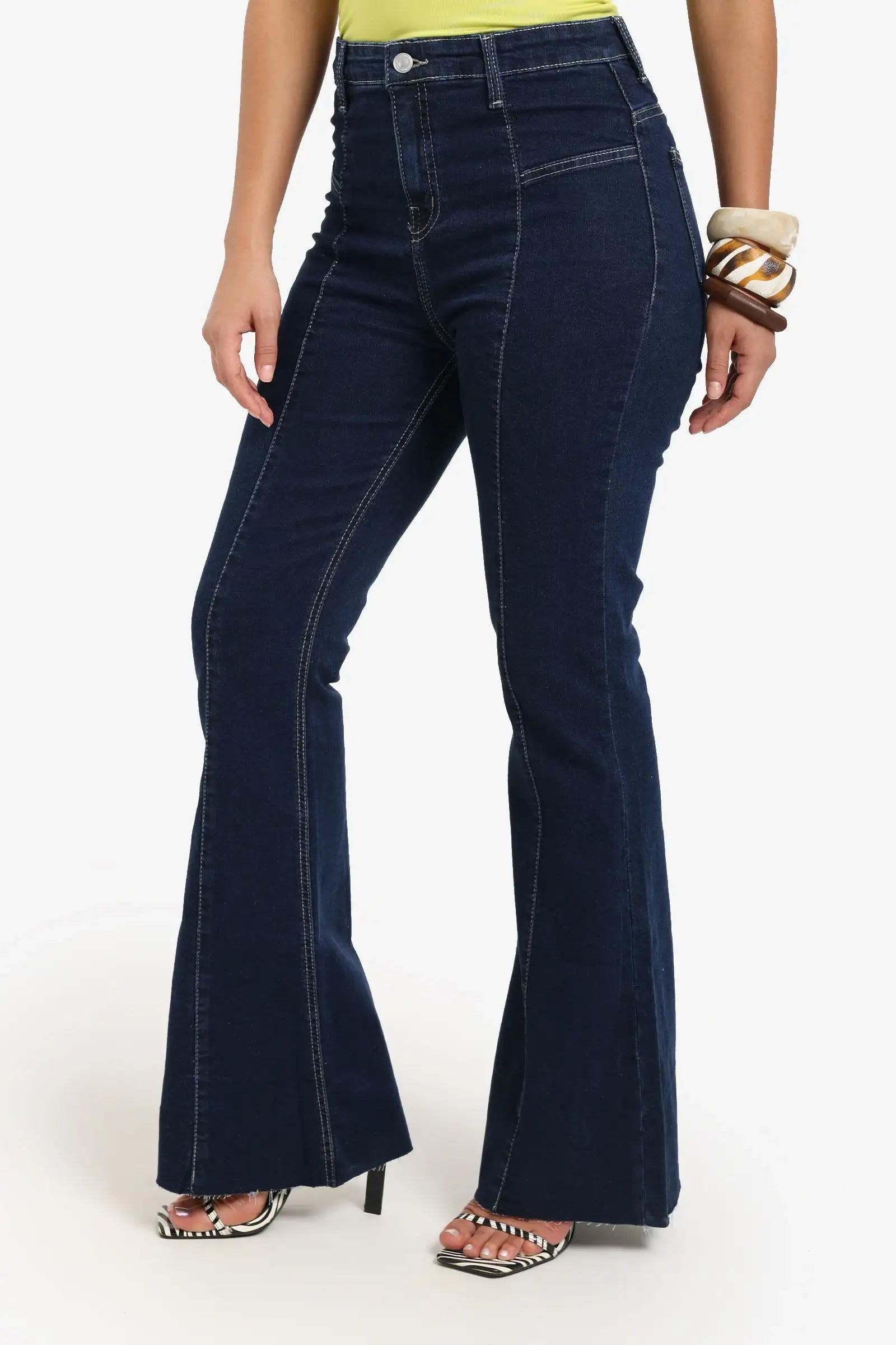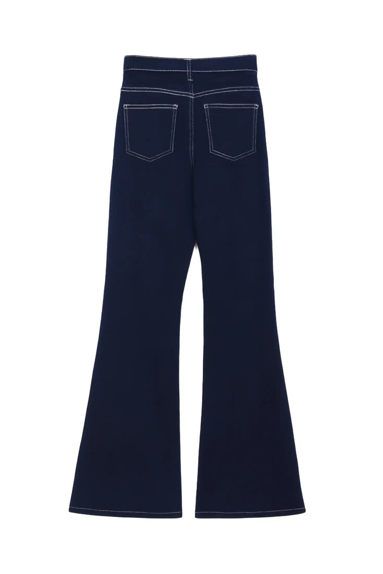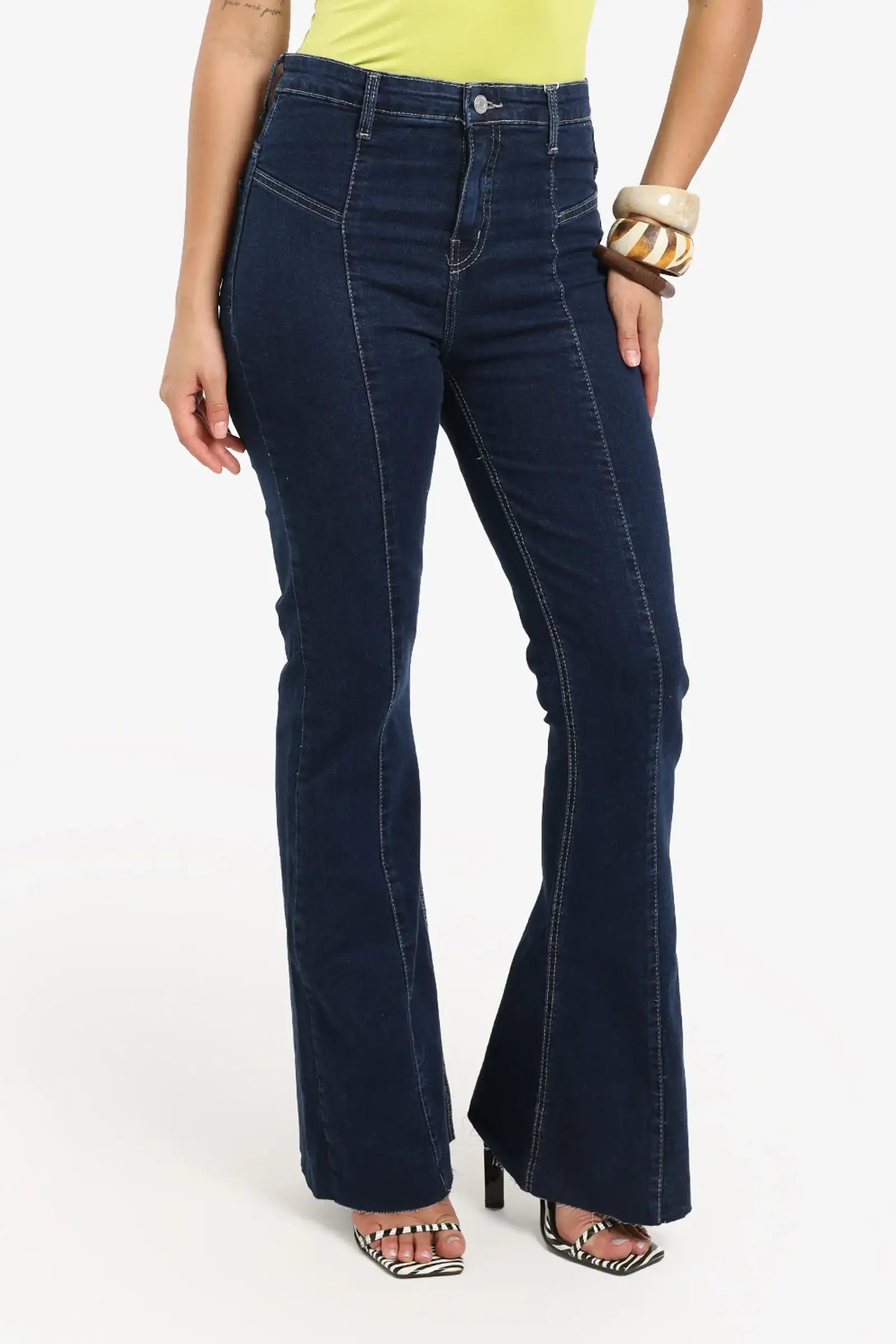 These high-waisted denim jeans feature a solid pattern for a sleek and modern look. They have built-in pockets and belt loops for added practicality, and a structured fit that accentuates the waist. The wide-leg design adds a retro touch, making them a versatile piece that easily transitions from casual to dressy.