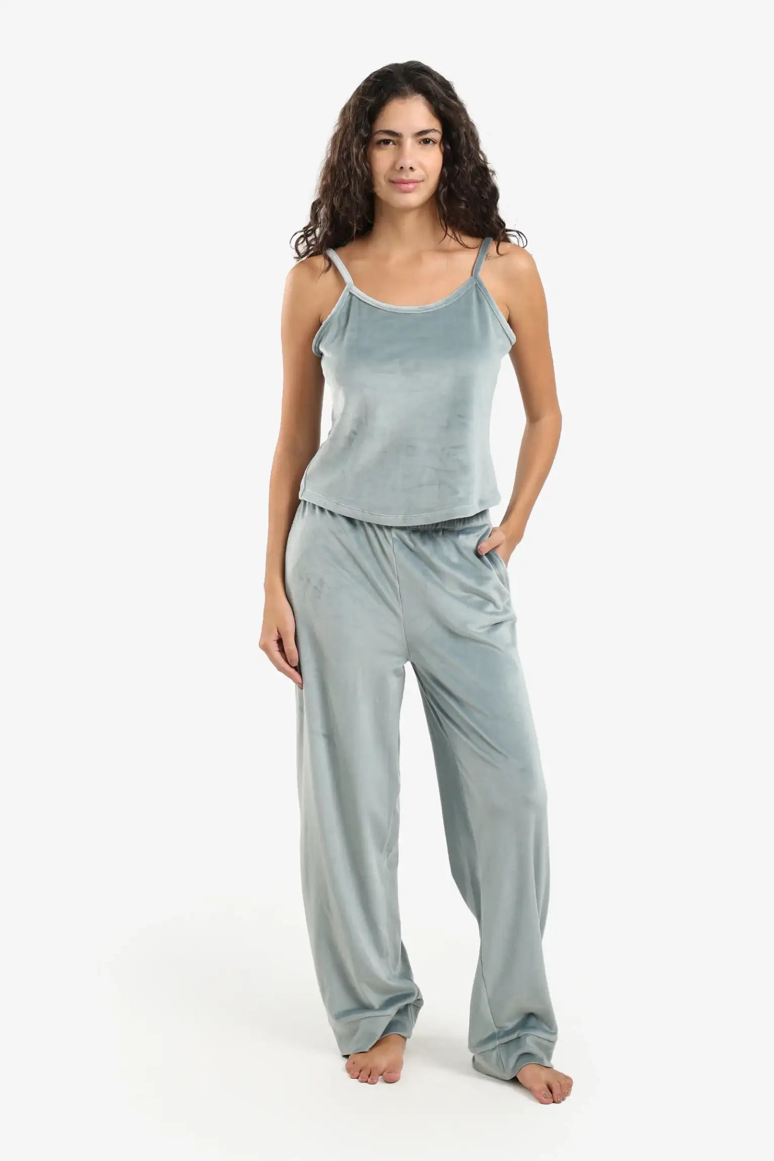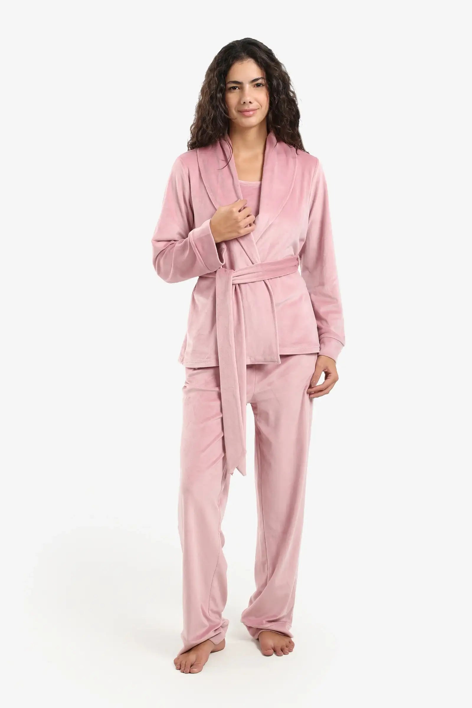 Indulge in comfort and style with this luxurious velvet pajama set, designed to keep you cozy and add a touch of luxury to your comfortable wear. Crafted from soft velvet in a solid pattern and a regular fit, this three-piece set offers unparalleled versatility and elegance. The top features a round neck and thin straps, giving it a lightweight and breathable feel. The straight-leg pants with an elastic waistband and side pockets ensure comfort and practicality for lounging or sleeping. To complete your look, the set includes a matching robe with an open neckline, long sleeves, and a detachable waistband, perfect for keeping warm.