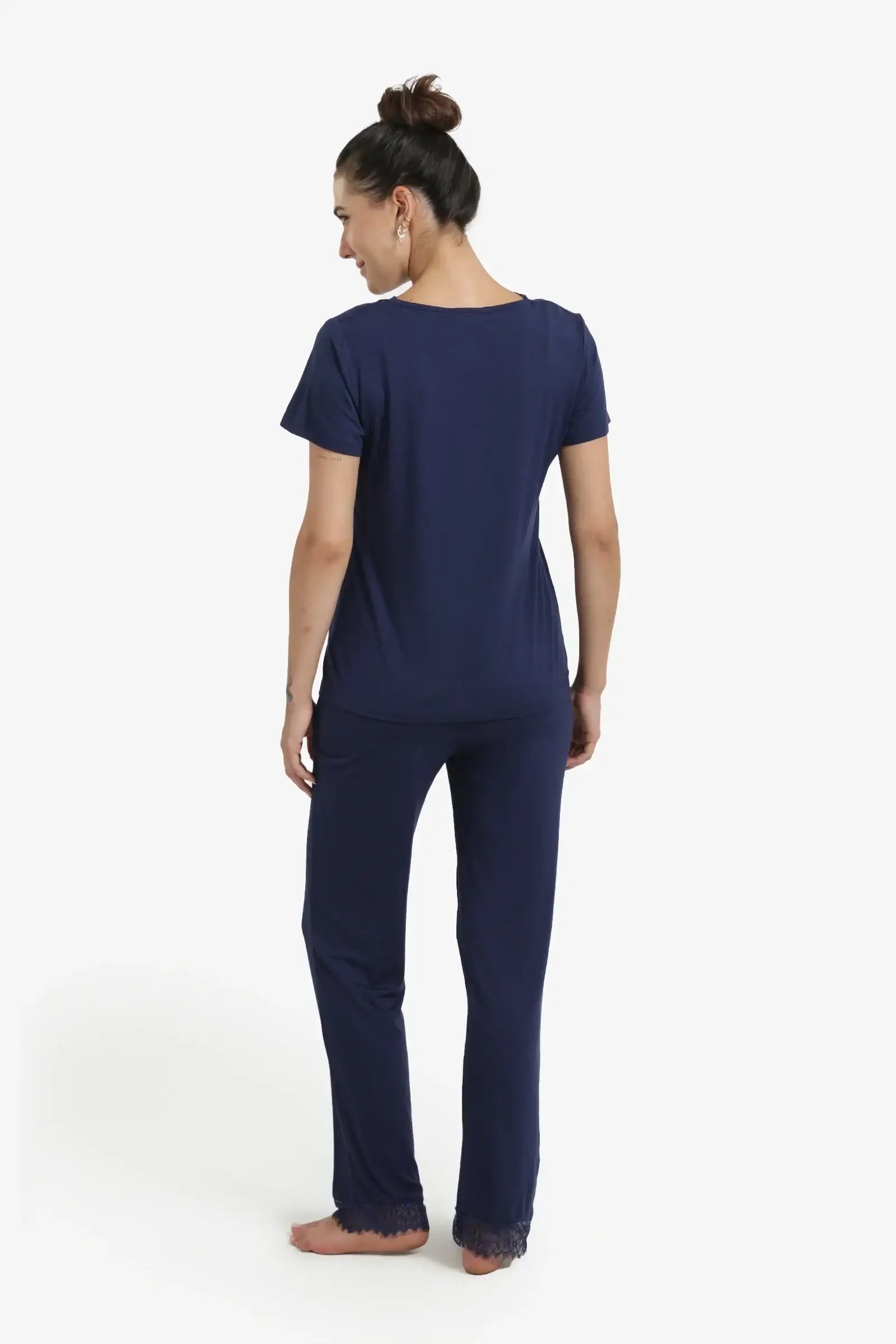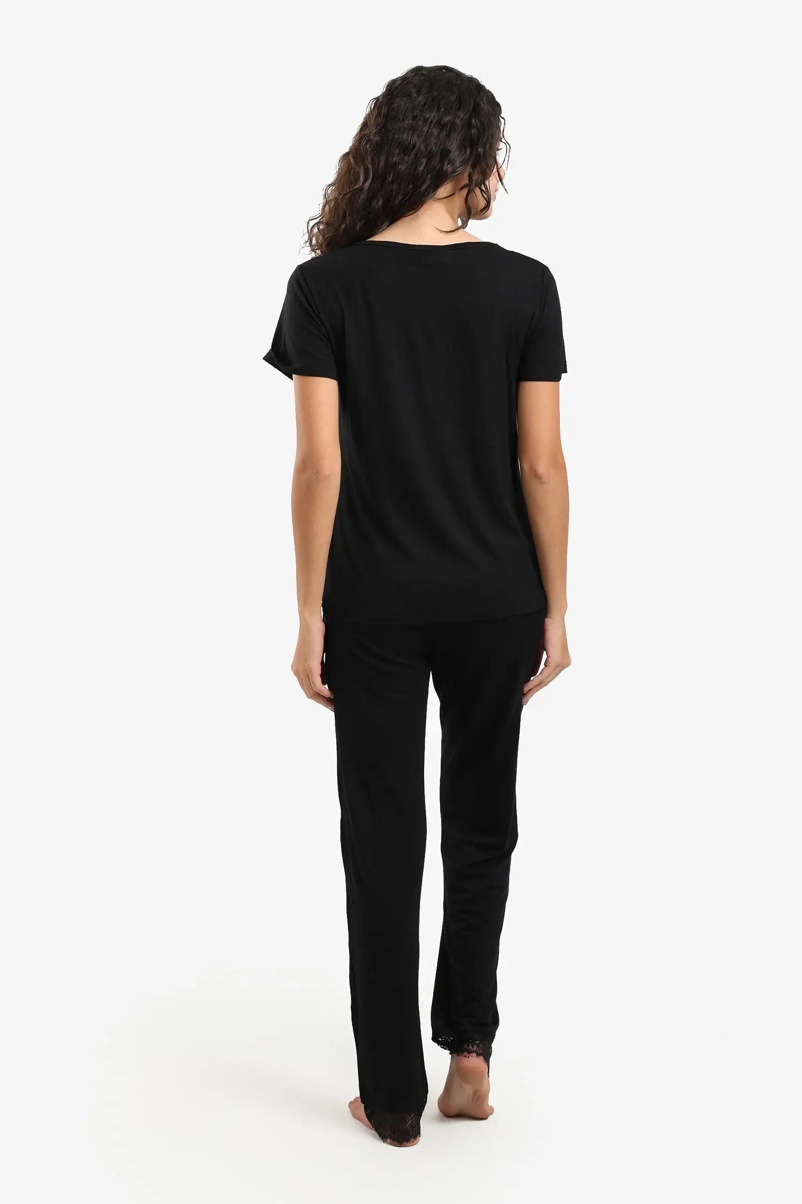 Relax in style with this women's pajama set crafted from a soft viscose blend, offering the perfect balance of comfort and elegance. Featuring a regular fit and solid color, this set is adorned with delicate lace trim for a touch of femininity. The top boasts a flattering V-neck, short sleeves, and a pull-on design. The long pants offer a comfortable, straight fit with an elasticated waistband and side pockets, ensuring you're perfect for lounging or sleeping.