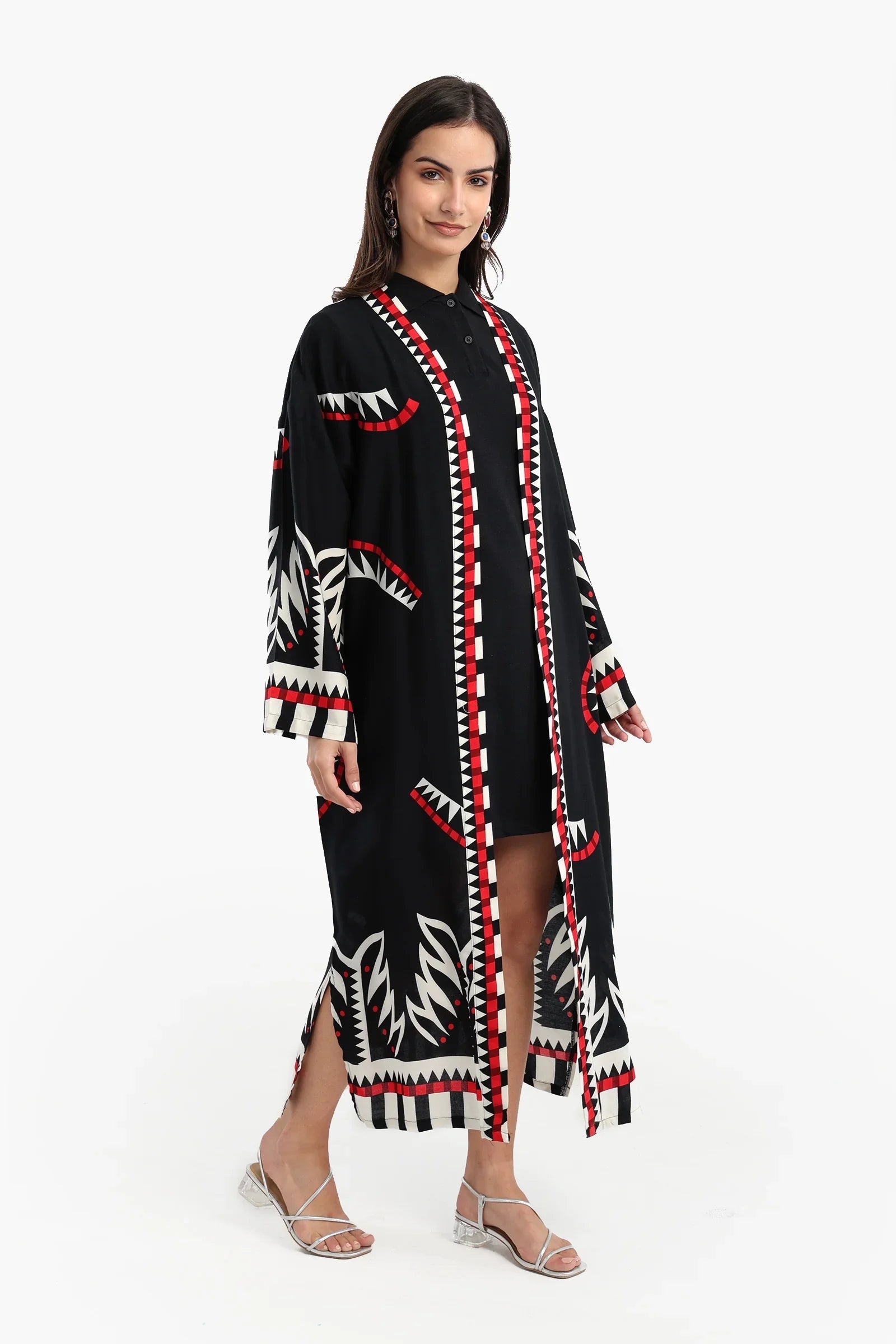 يتميز هذا الكيمونو المصنوع من الفيسكوز بقصّة مريحة مع طبعة هندسية جريئة مستوحاة من الطراز القبلي باللون الأسود والأحمر والأبيض. يتميز بياقة مفتوحة وأكمام طويلة وواسعة، وتصميم مريح وانسيابي، مما يجعله مثاليًا للارتداء مع طبقات متعددة. تضفي التفاصيل المتباينة على طول الفتحة الأمامية والأصفاد لمسةً جماليةً أخّاذة.